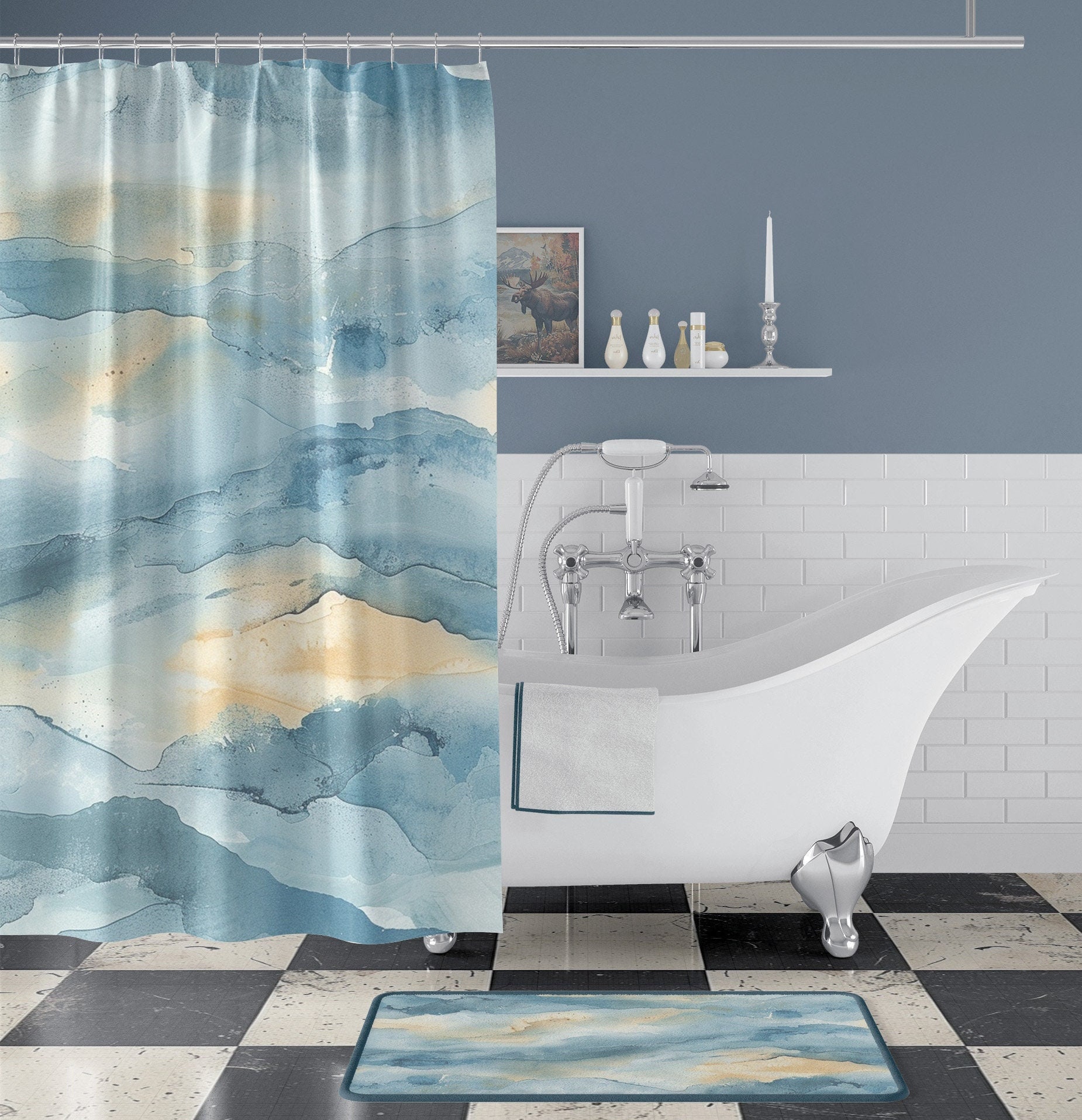 "Transform your bathroom with our Blue Beige Abstract Shower Curtain, featuring a stunning wate...