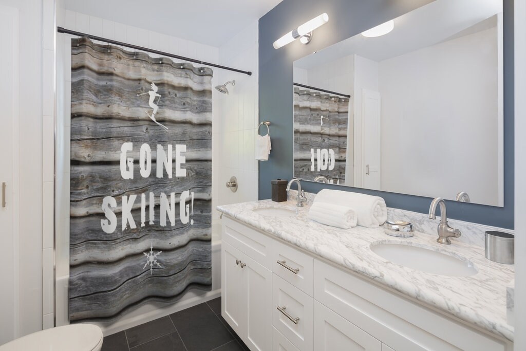 "Gone Skiing Bathroom Shower Curtain, Ski House Decor. Customize your bathroom decor with uniqu...