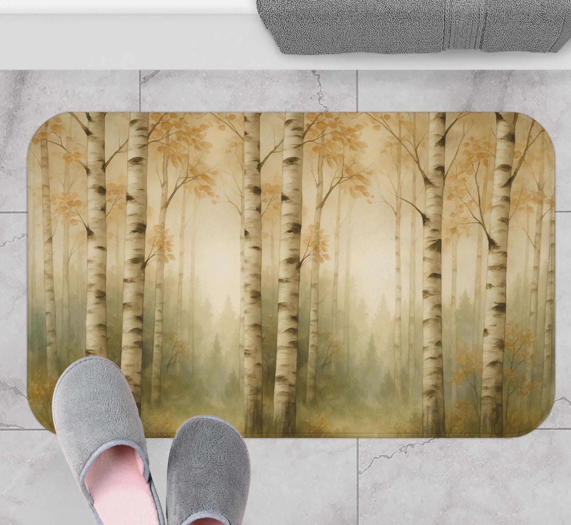 "Bring the beauty of the outdoors into your bathroom with this forest bath mat featuring a sere...