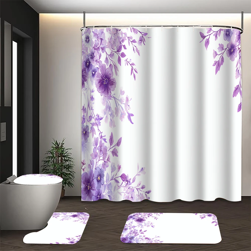 4/1 Purple plants shower curtain set, toilet seat decoration, showe...