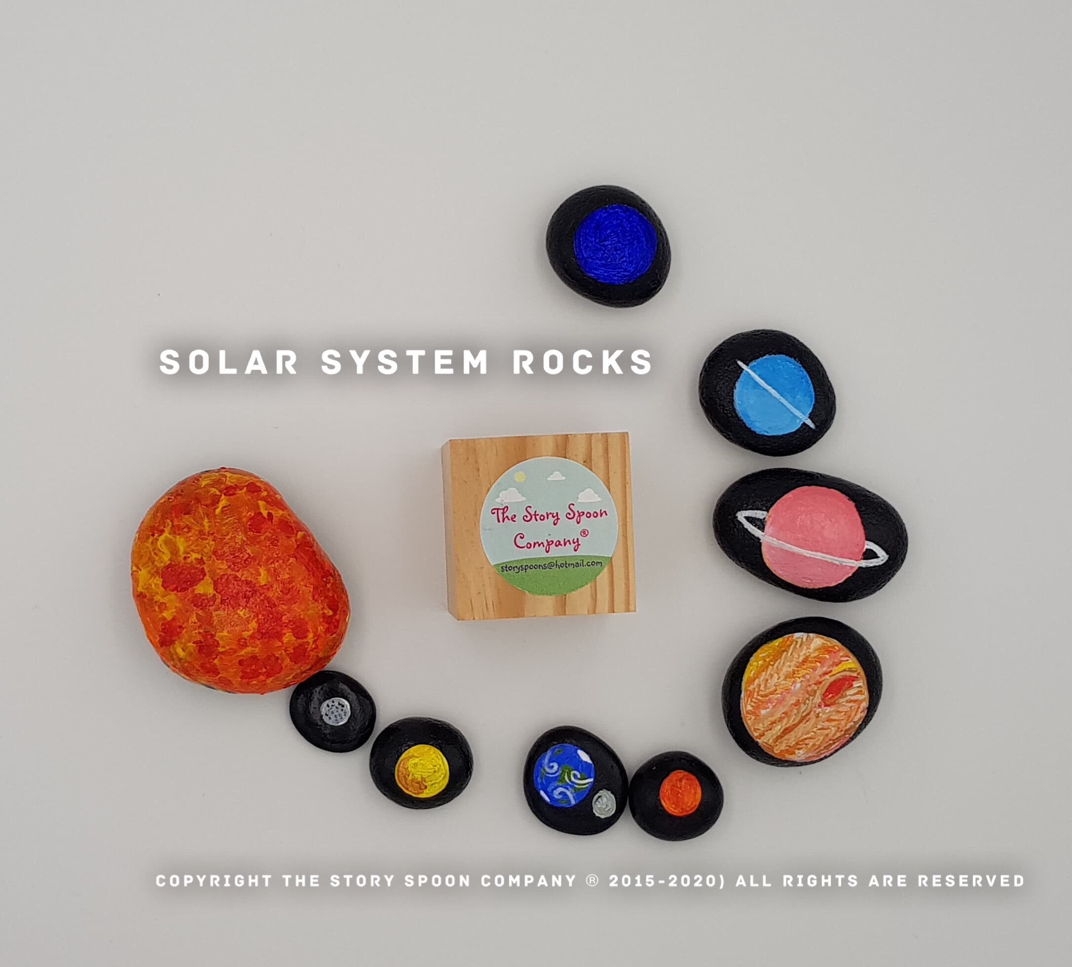 A set of 9 handpainted Solar system stones with space factsheet enclosed in a printed drawstring cot...