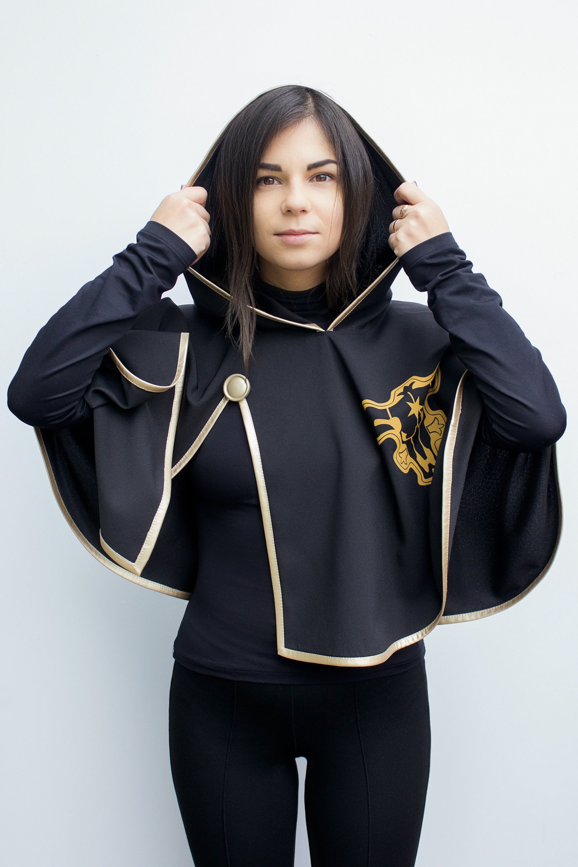 In this listing included: Cape - black suit fabric cape with golden edging and hand painted stencil ...