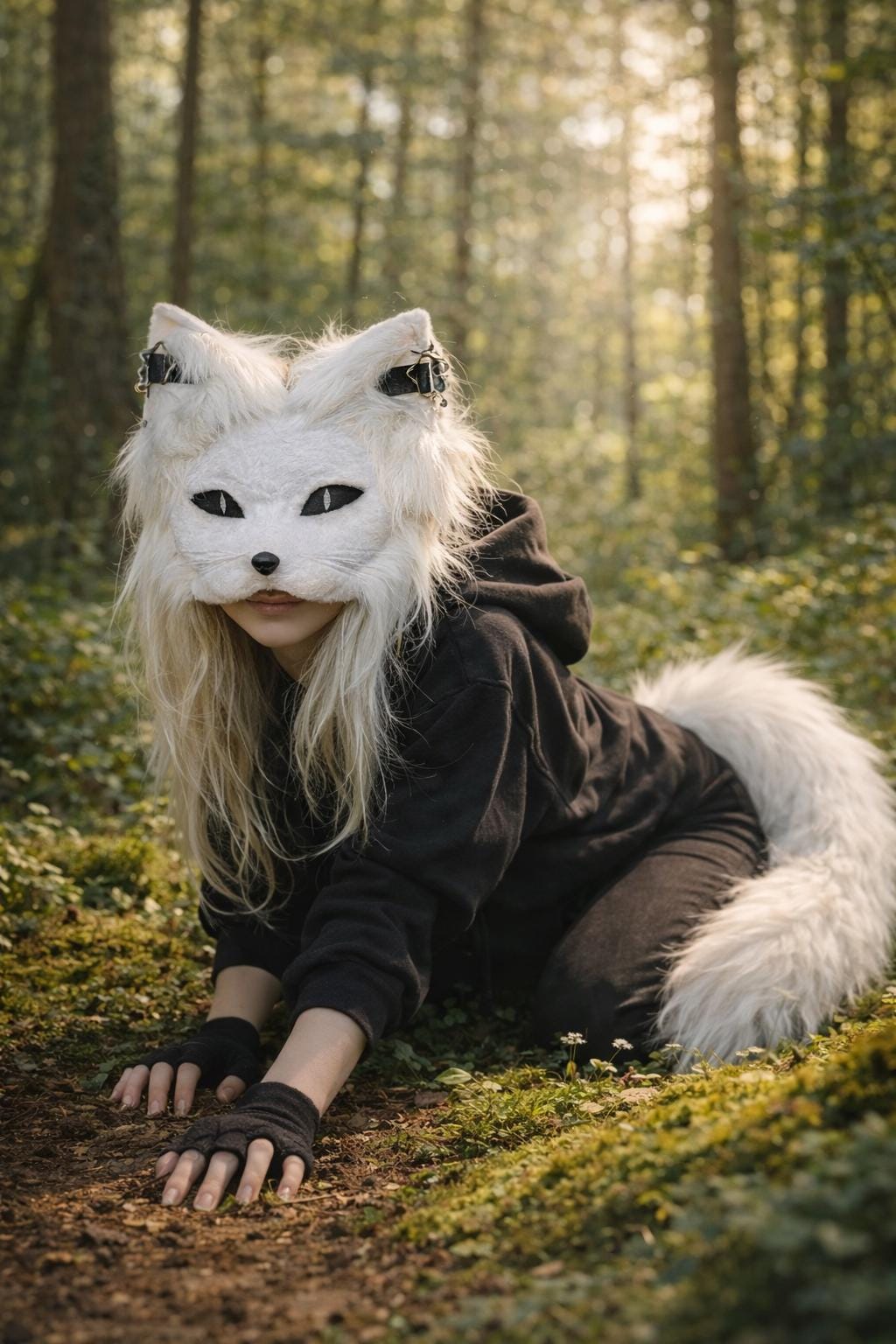 Embrace your inner feline with this beautifully handmade white cat therian mask and tail set -- the ...