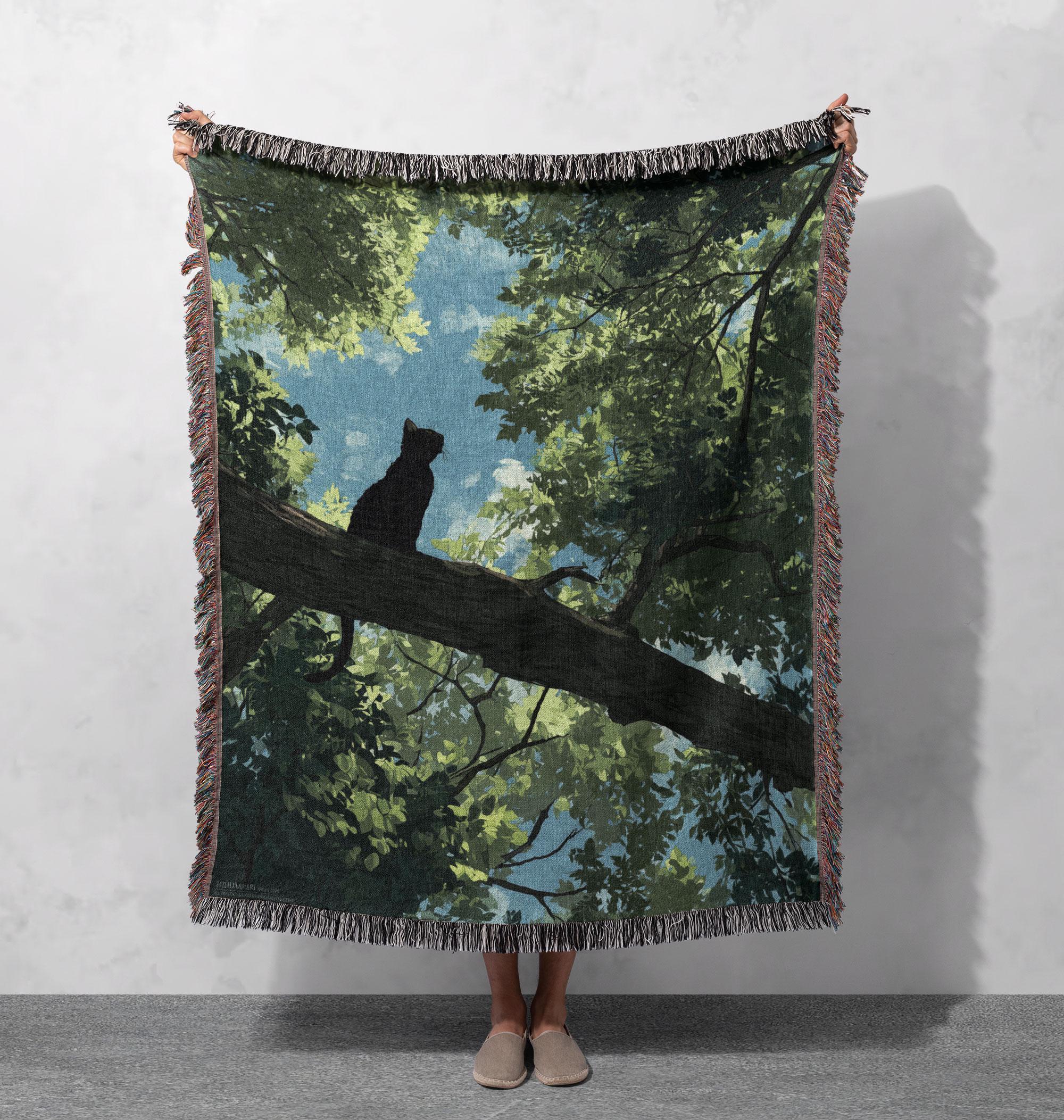 "Black Cat In Tree Forest Scene Woven Blanket 100% Cotton, Nature Lover Throw Blanket Gift, Mys...
