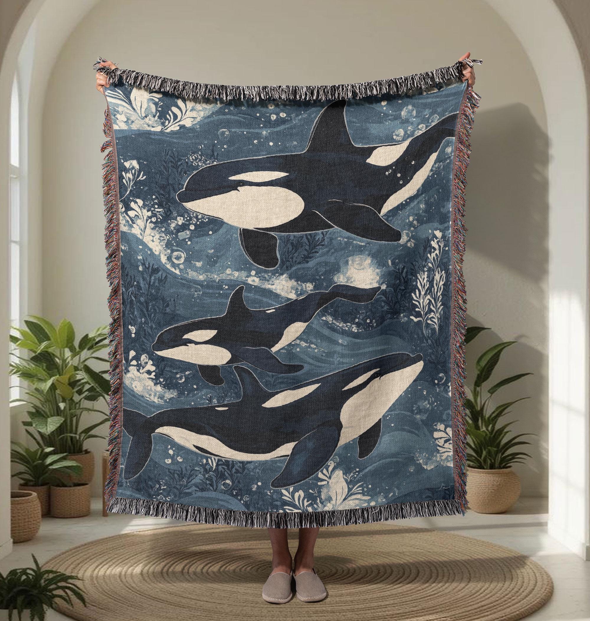 Dive into the deep blue with this stunning Orca Whale Pod Woven Blanket. A perfect marine biologist ...