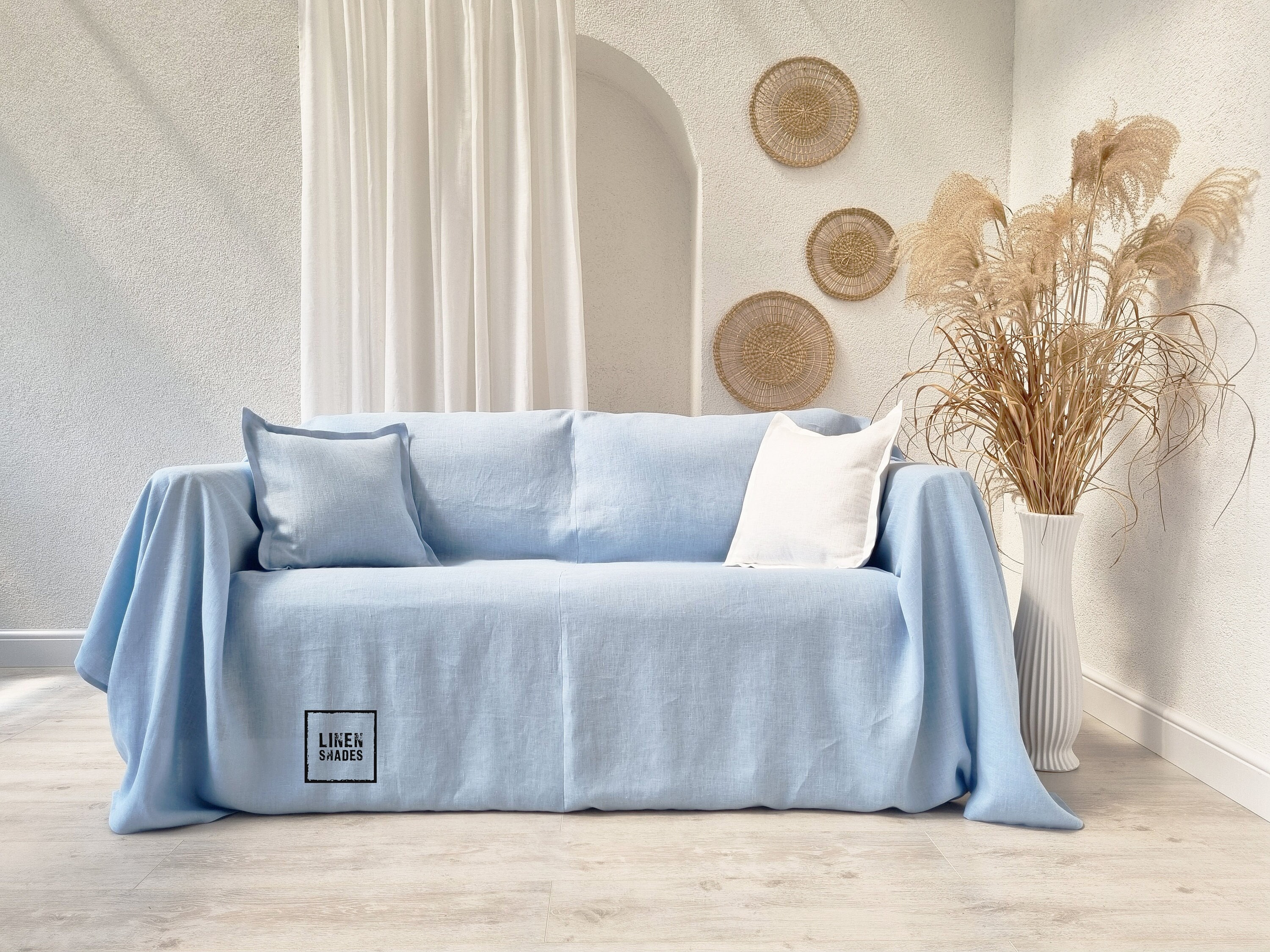 Sky blue linen couch cover.Blue linen bedspread. Blue custom size c...