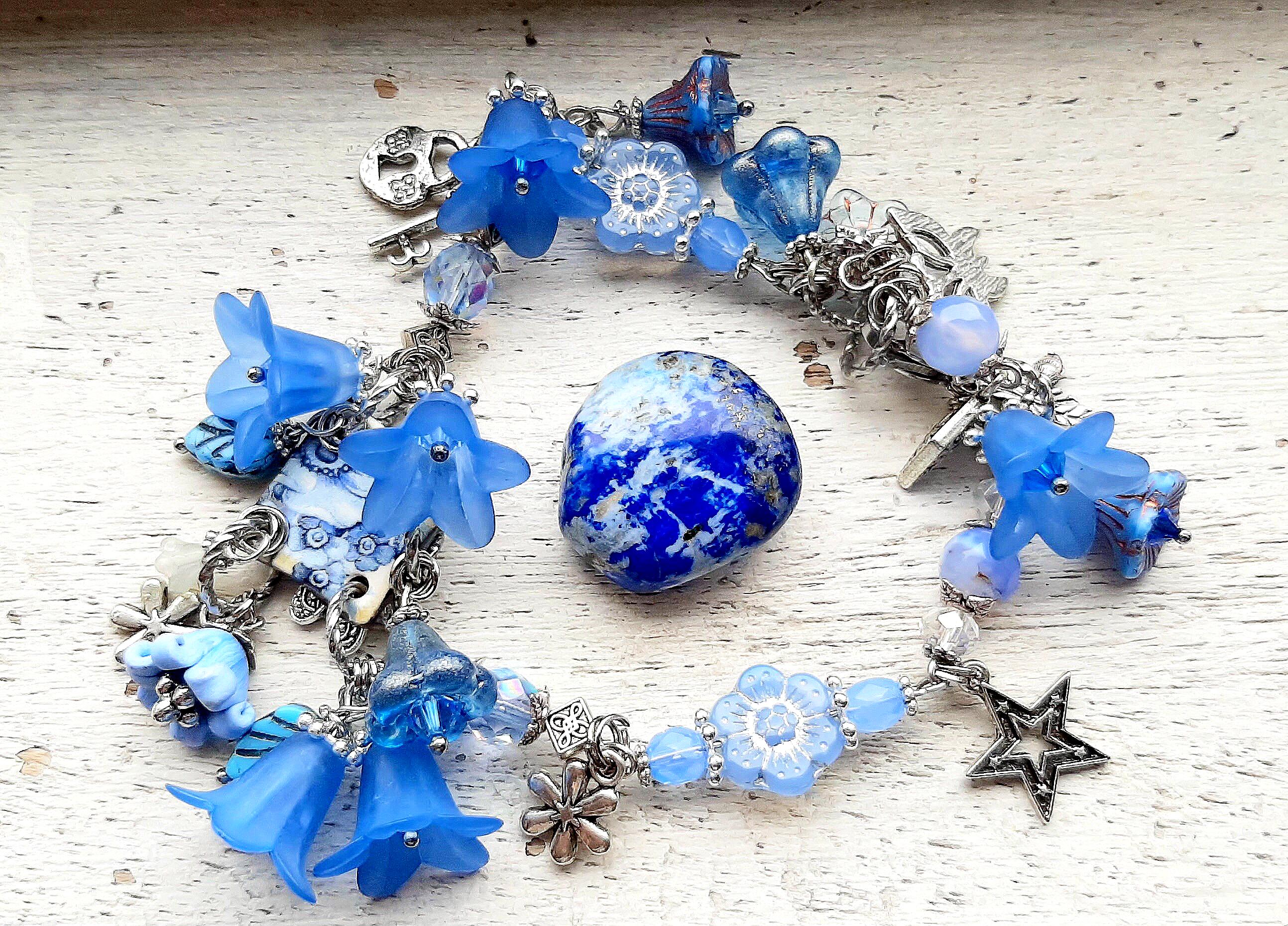 Cornflower/Periwinkle Blue artisan made ceramic bracelet. 8mm faceted blue Agate, Silver, Flower / F...