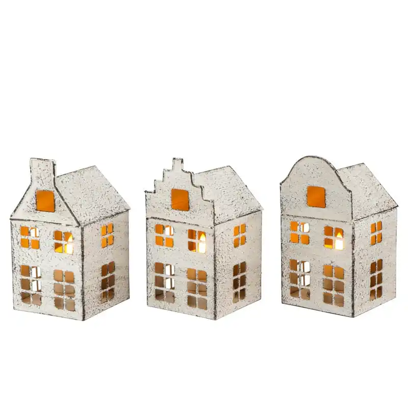 Set of Three Metal House Shape Candle Holders Beige White Village F...