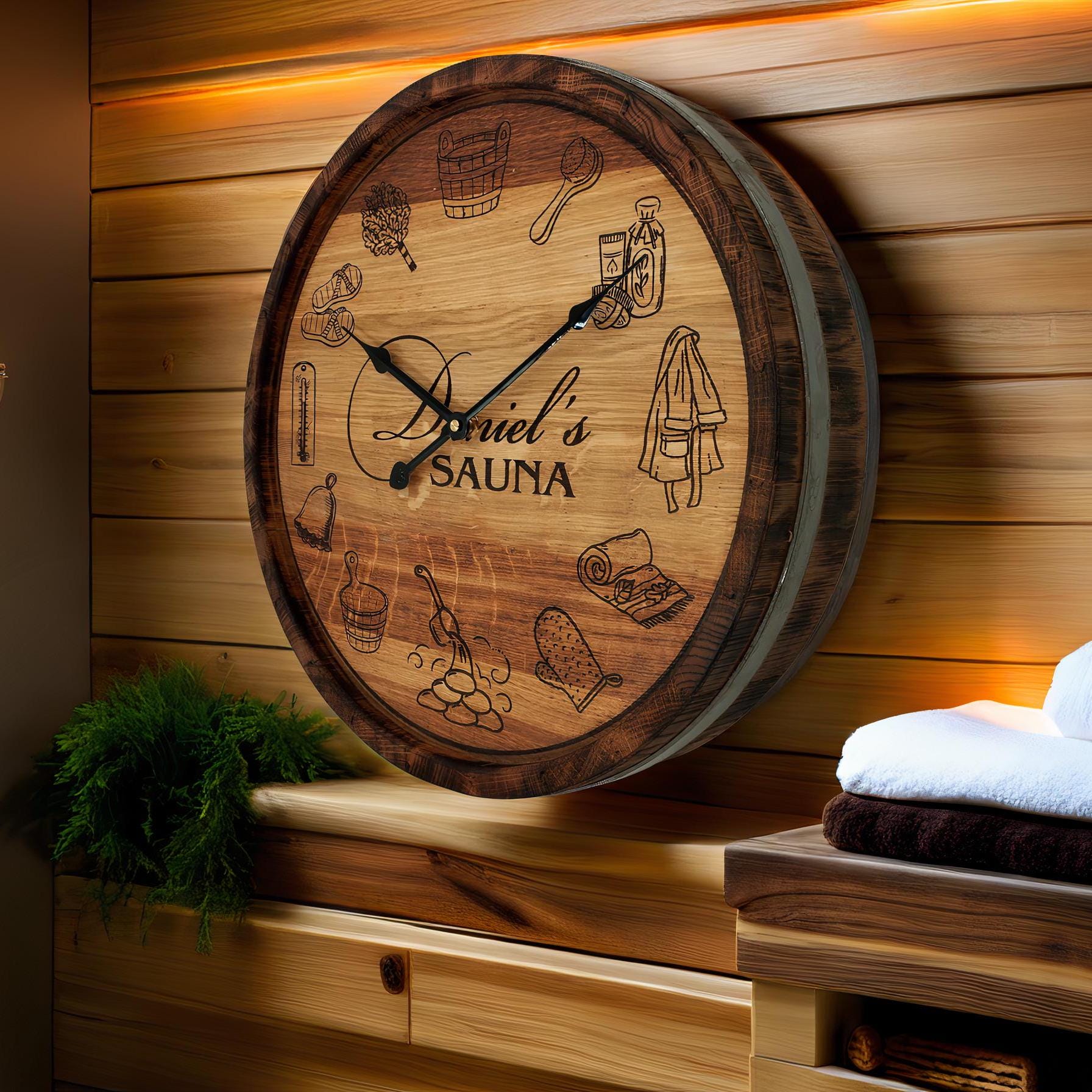 Personalized Sauna Whiskey Barrel Clock, Custom Oak Barrel Head, Vi...