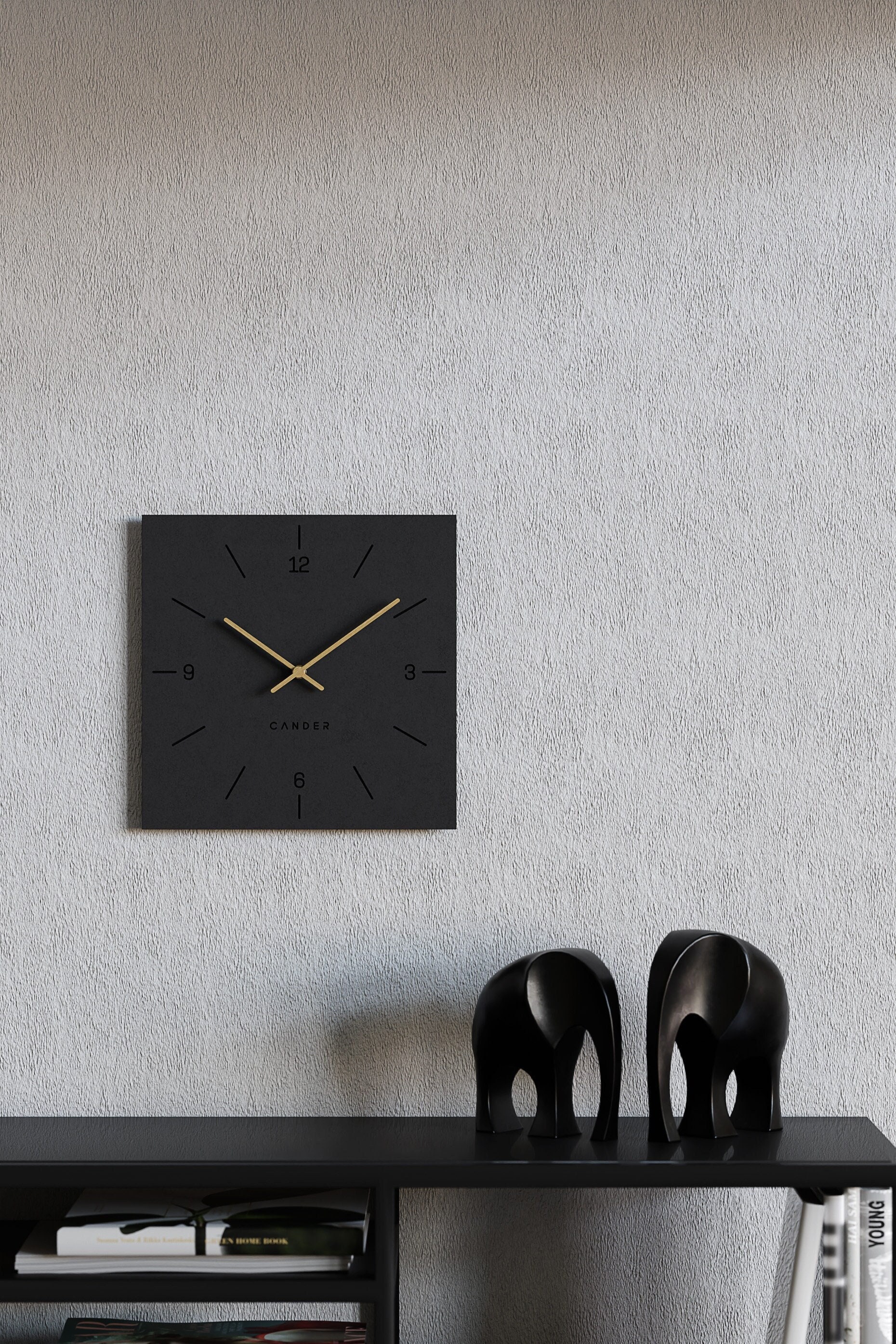 - Analog wall clock made of MDF in black - Side length: 30.5 cm - Noiseless movement without ticking...