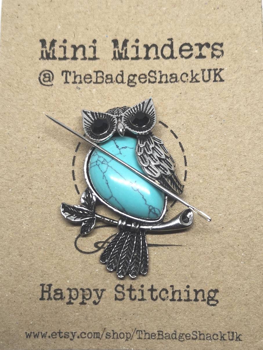 Owl needle minder with turquoise stone , needle keep, needle magnet, needle nanny, needle holder, ne...