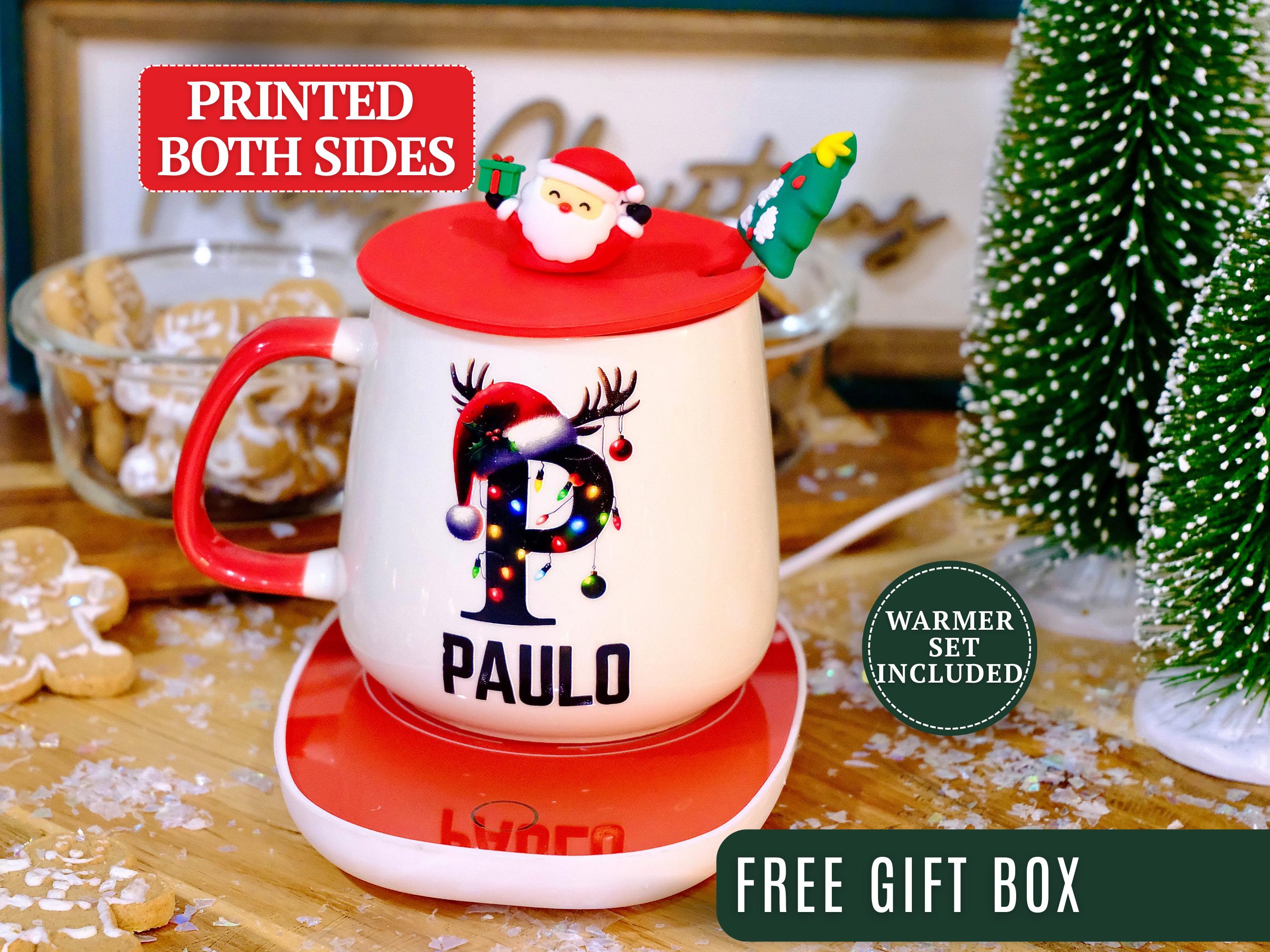 Personalized Christmas Mug with Names and Warmer Set, Coffee Cup Se...