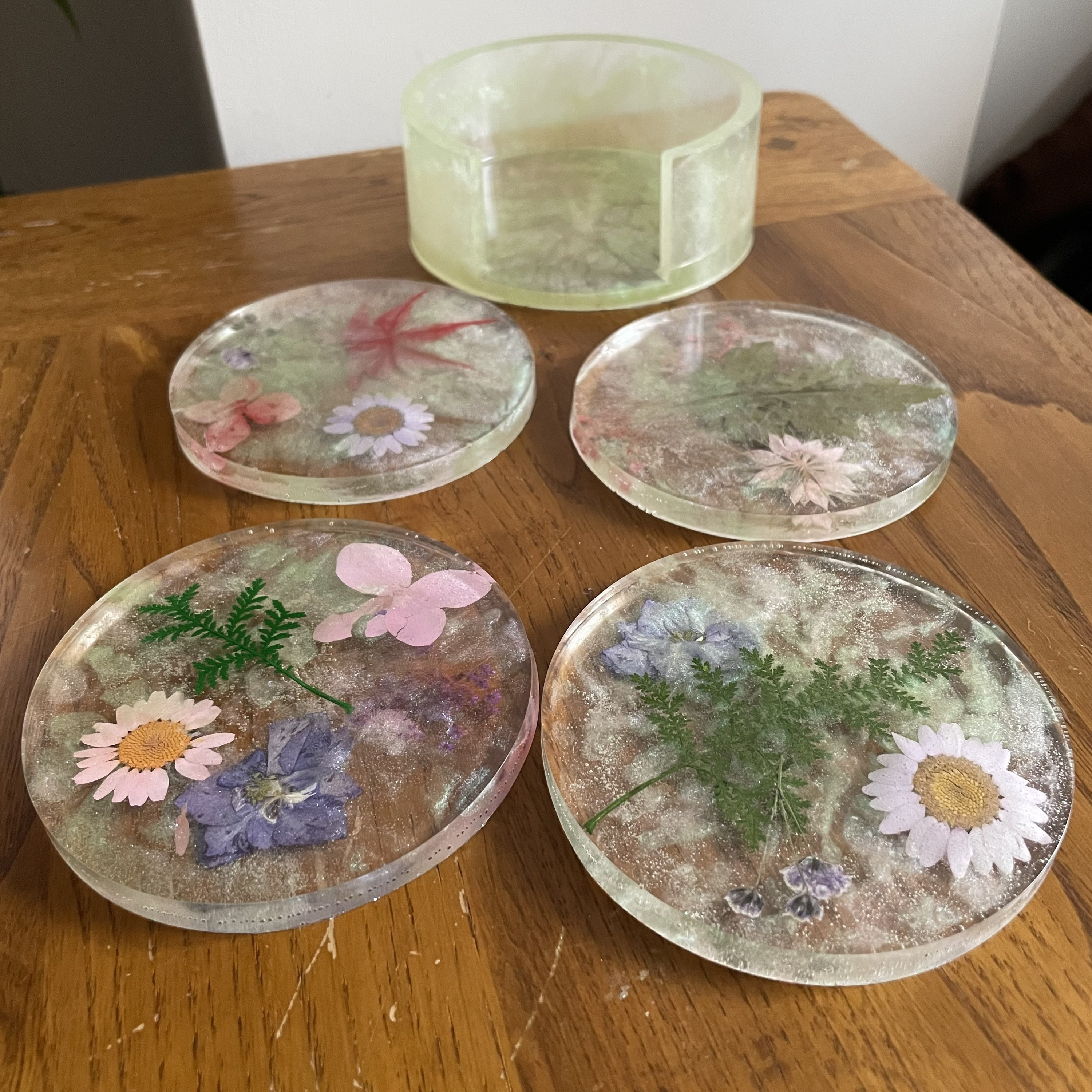 Set of four dried flower resin coasters with holder Custom made to order Available in a range of col...