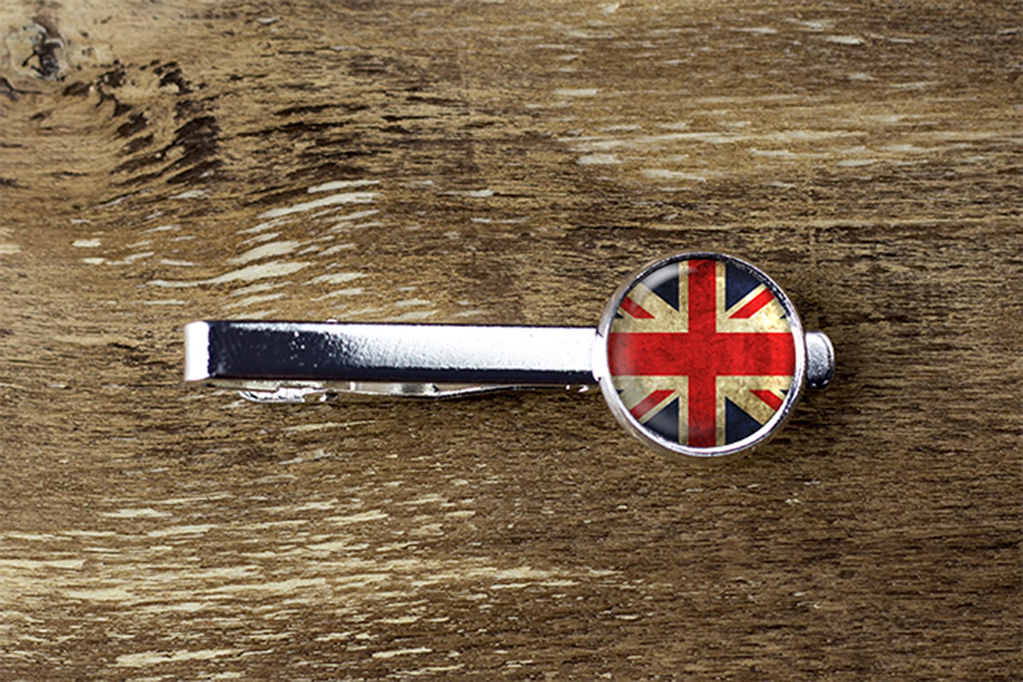 British Flag silver plated brass tie clip(black font). The tie clips image covered by a high grade e...