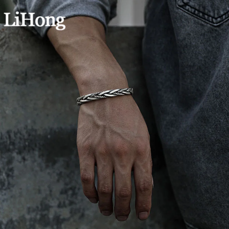 925 Sterling Silver Bangle Retro Thai Silver Braided Twist Open Bangle Cuff Links For Men & Wome...
