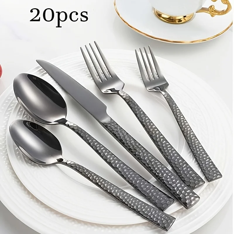 20-Piece with Black Hammered Square Edge Stainless Steel Silverware...