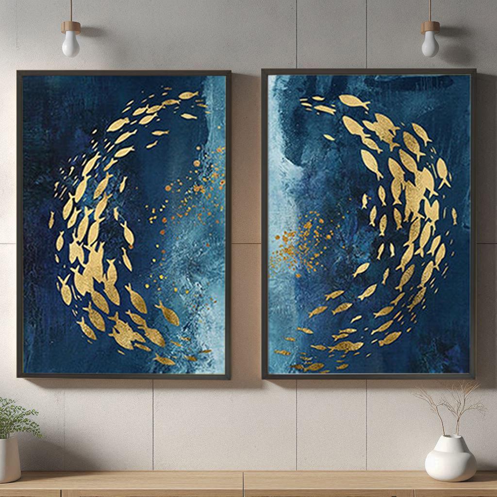 Elegant Gold Fish Poster Set - Modern Blue and Gold Wall Art for Ho...