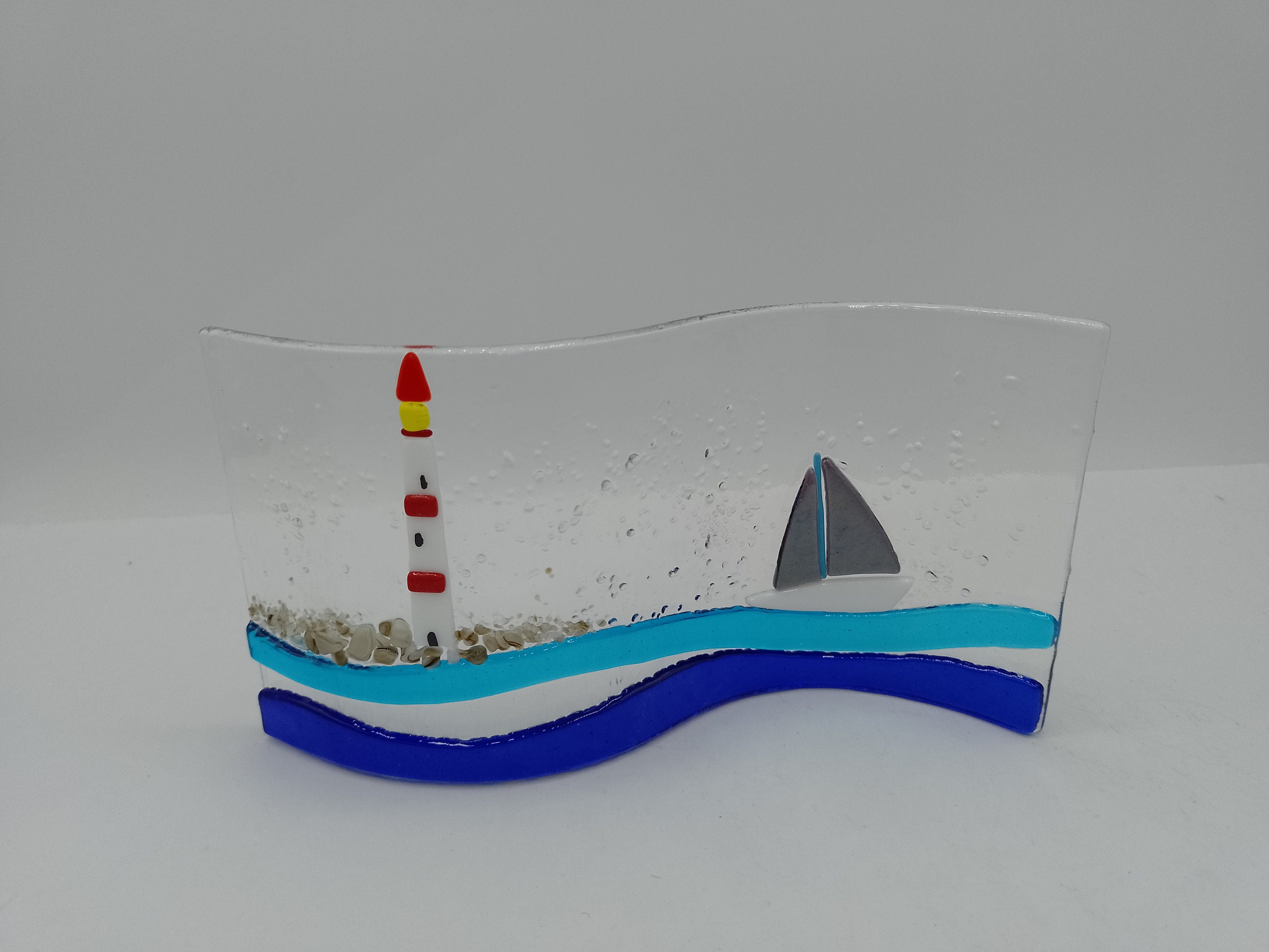 A perfect glass wave featuring a cut glass boat on a blue glass sea and a lighthouse which is create...