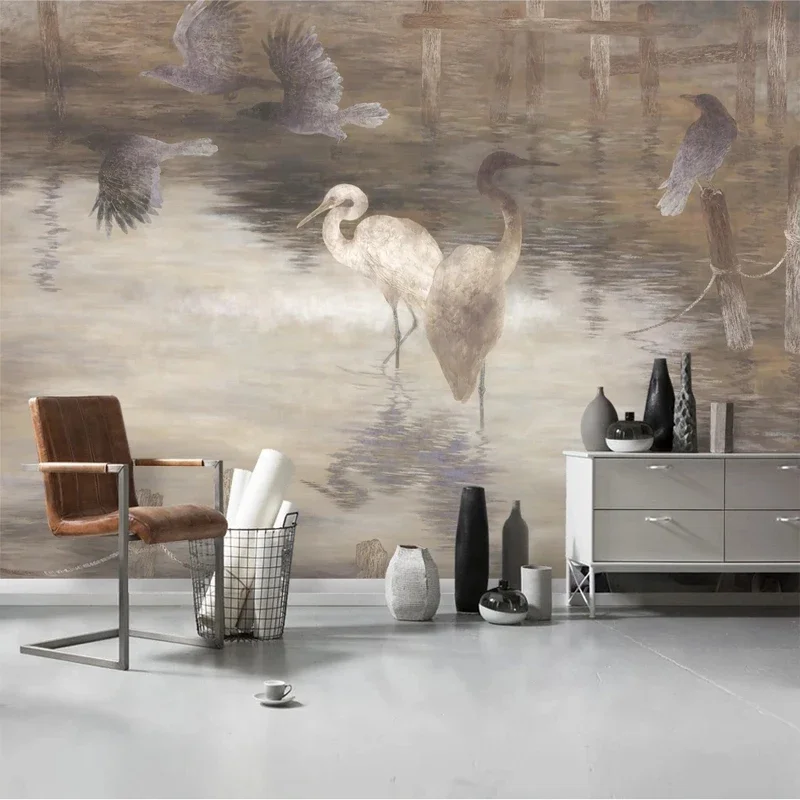 Retro Home Decoration 3D Photo Mural Paper Nature Lotus Pond Crane Wallpaper for Bedroom TV Backgrou...