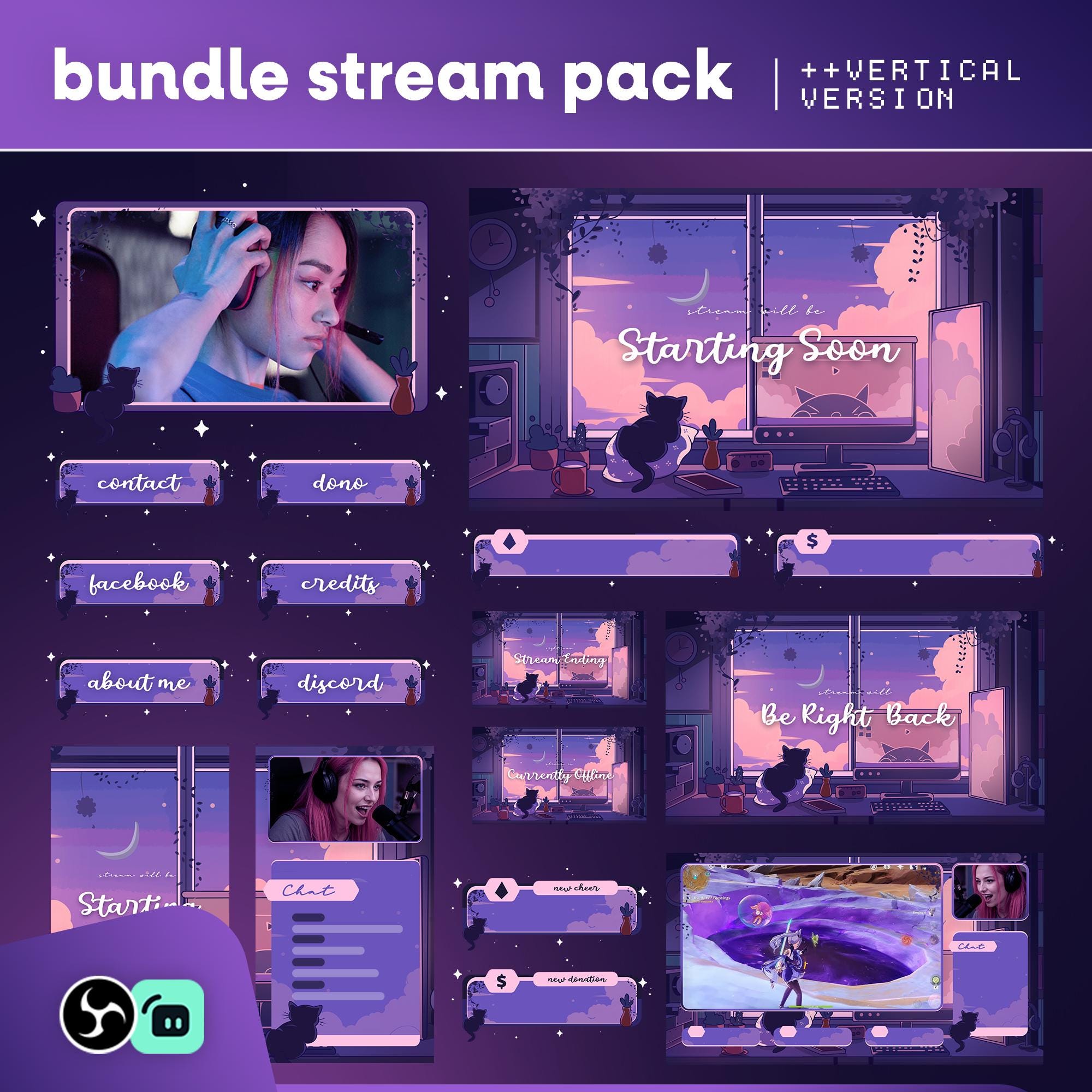 Cozy purple cat animated stream pack with cute feline lofi desk scenery for Twitch, TikTok, Kick, an...
