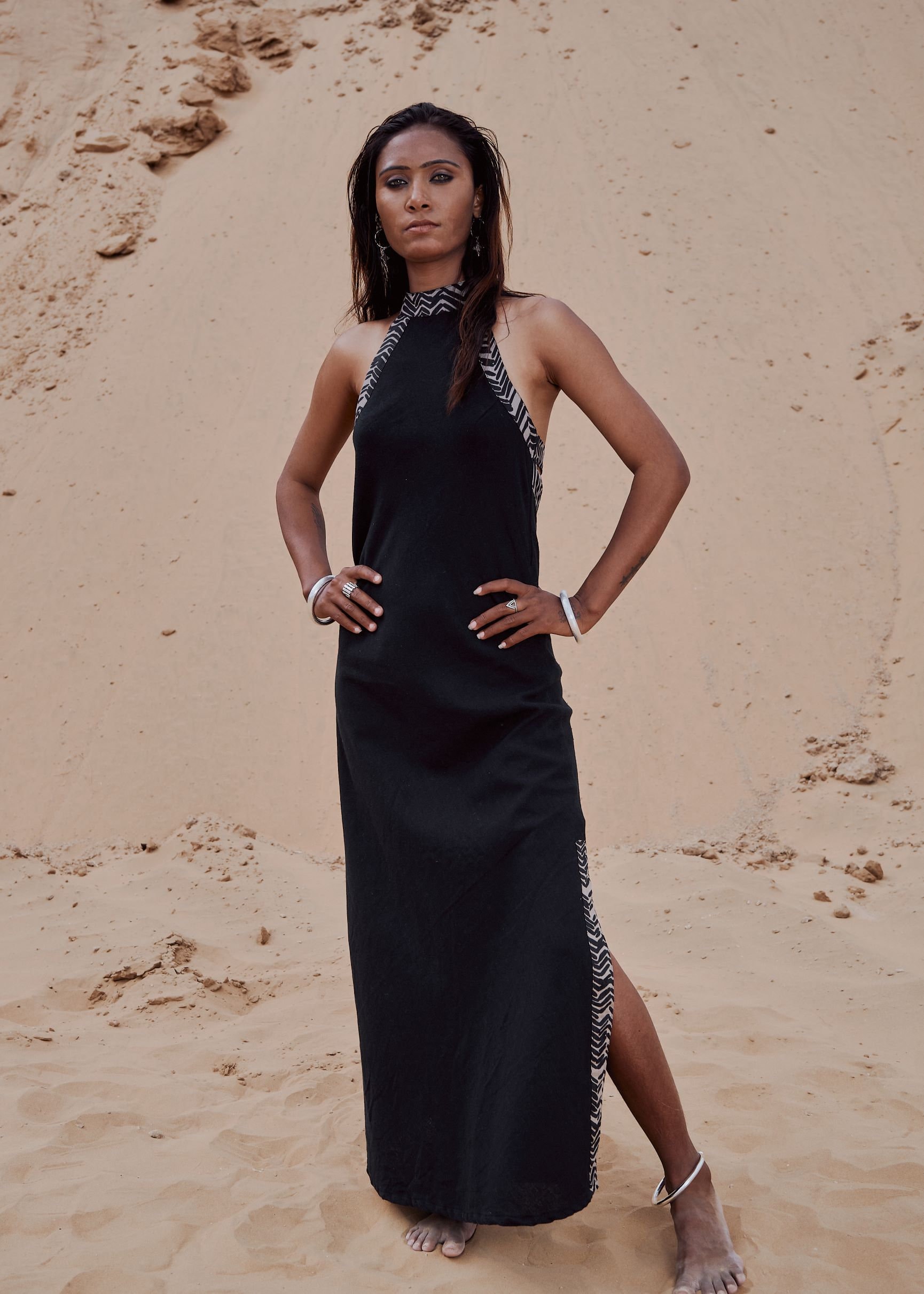 KALIKIO dress, halter long dress made in cotton knitted like the jute, with a print ethnic border, w...