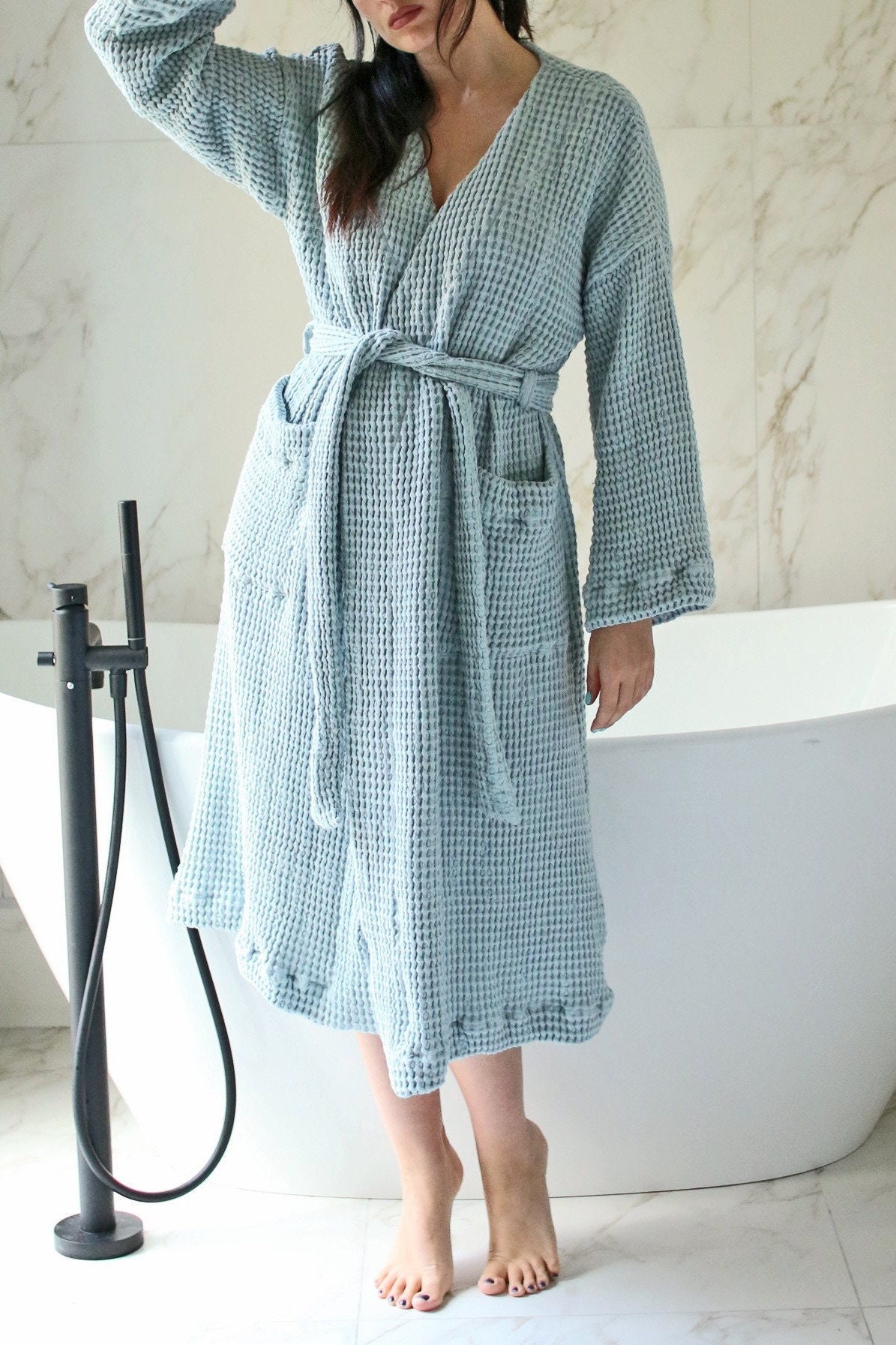 Waffle Linen Robe Mid Calf, Classic Robe, Linen Spa Robe, Sauna Rob...