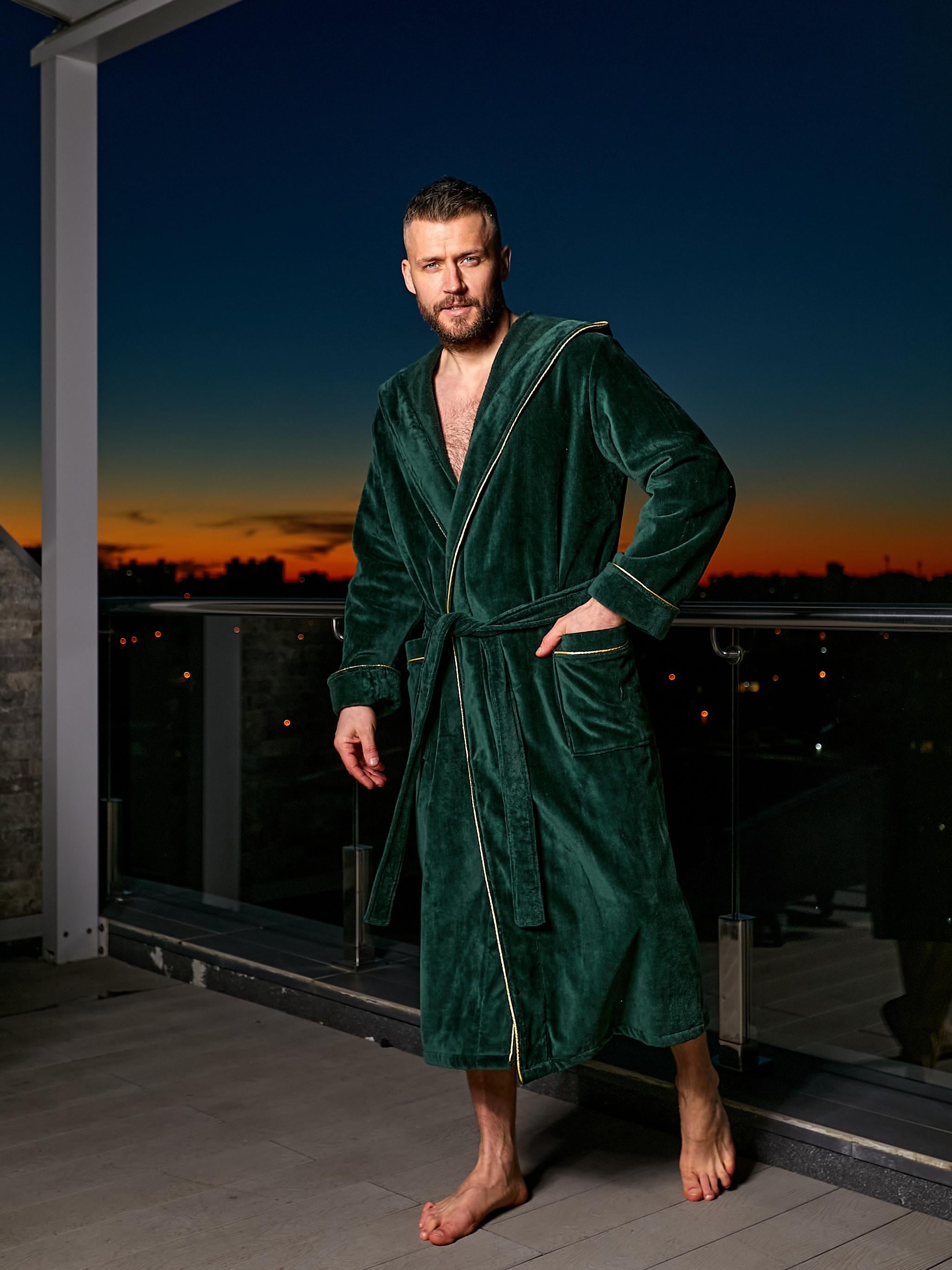 Men's Velour Bathrobe with Hood, 100% Cotton - Soft Absorbent Showe...
