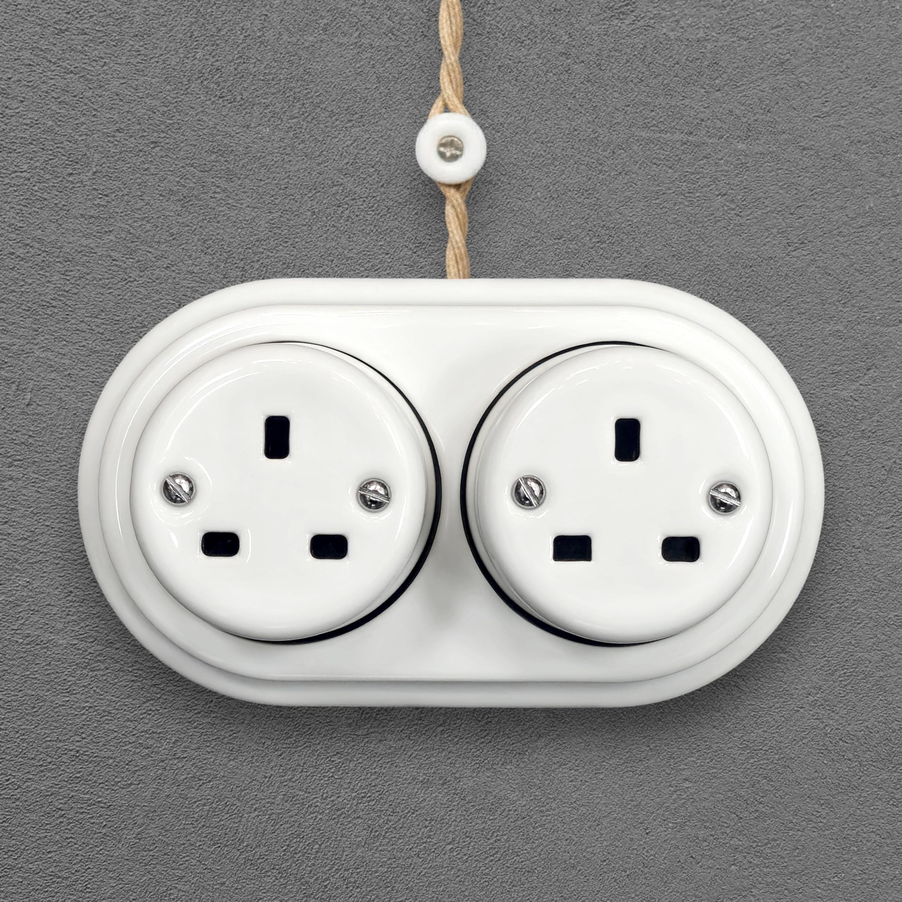 Double White Porcelain UK Plug Socket, Vintage Style Surface Mount