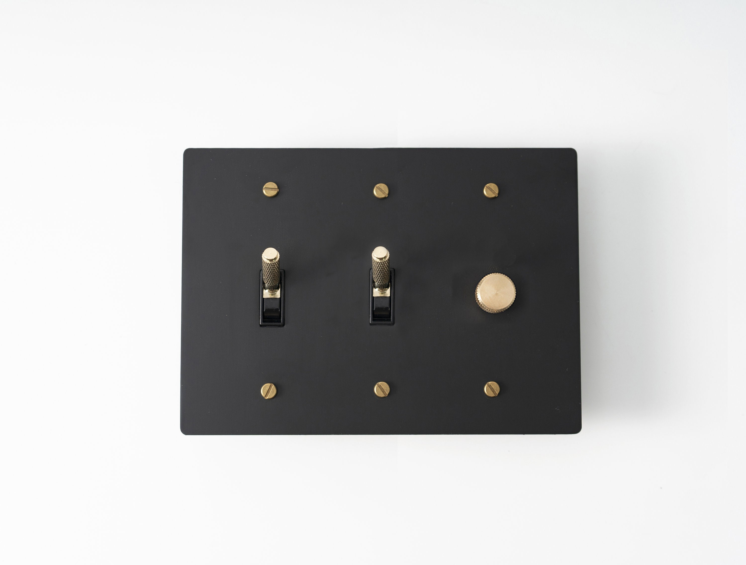 "Dual Toggle and Dimmer Combo Switch Plate - Matte Black with Brass Accents Material: Solid Bra...