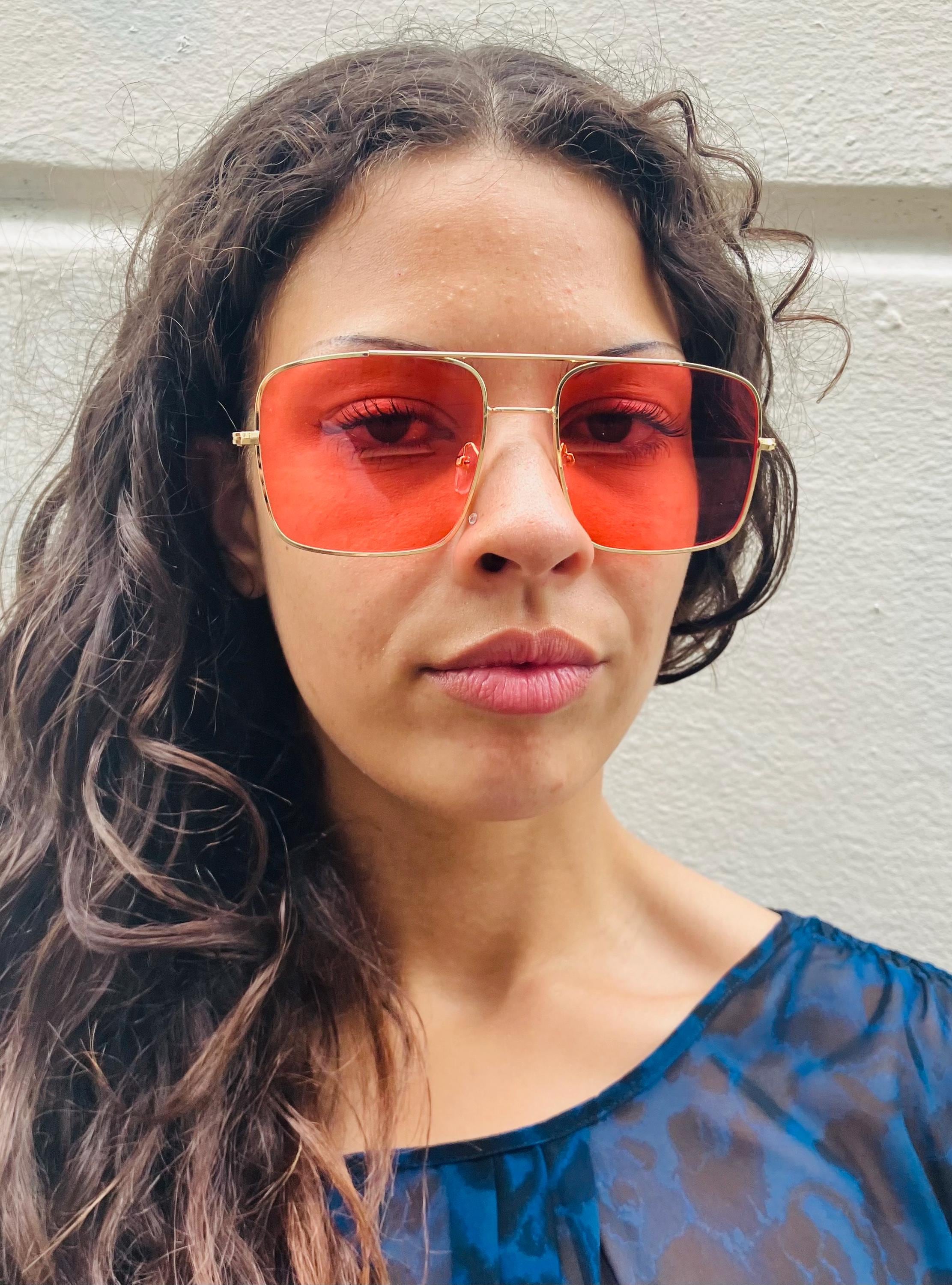 Berty And Gerty Vintage present these amazing gold metal aviator sunglasses with orange lenses. Come...