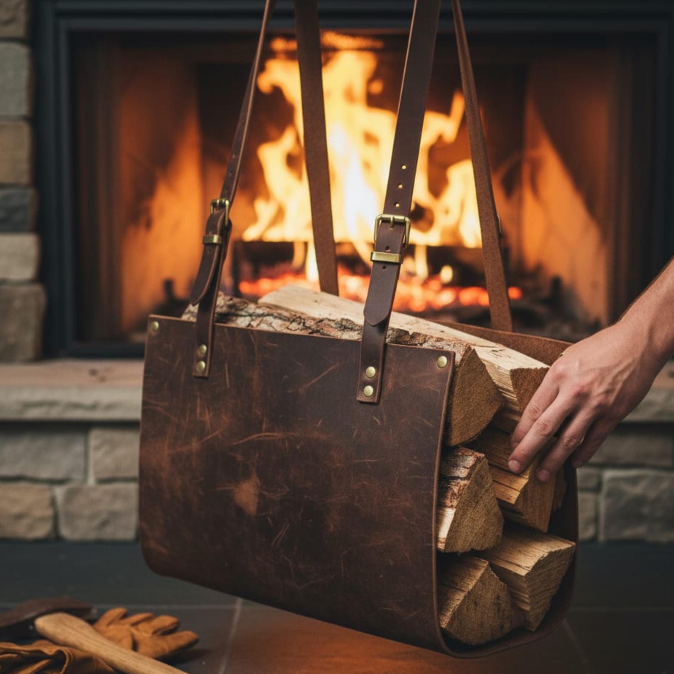 Full-Grain Leather Firewood Carrier,Premium Log Tote Bag for Firepl...