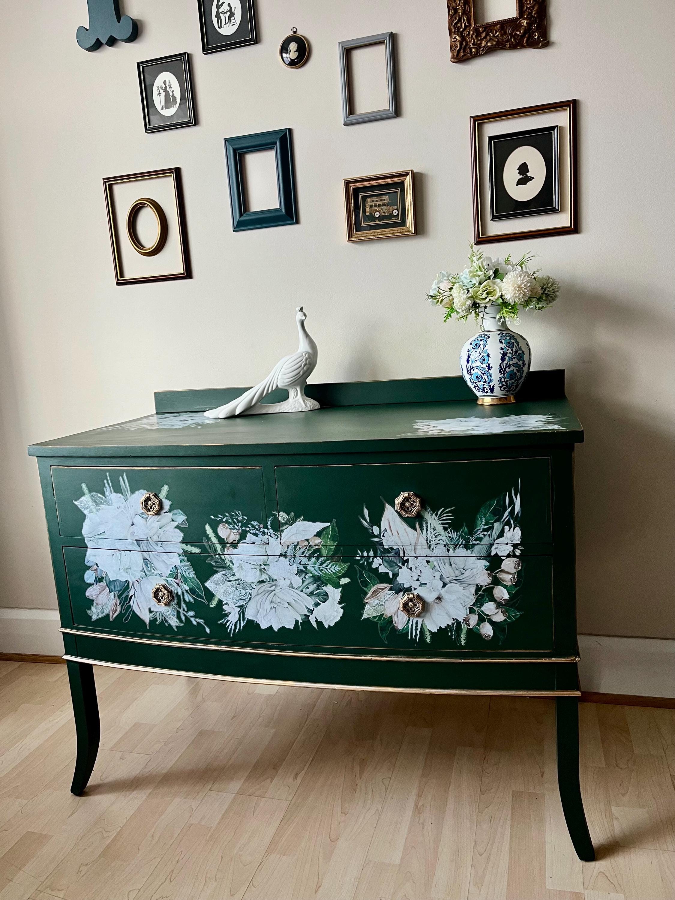 Elegant Green Floral Chest of Drawers , Cabinet with Gold detailing...
