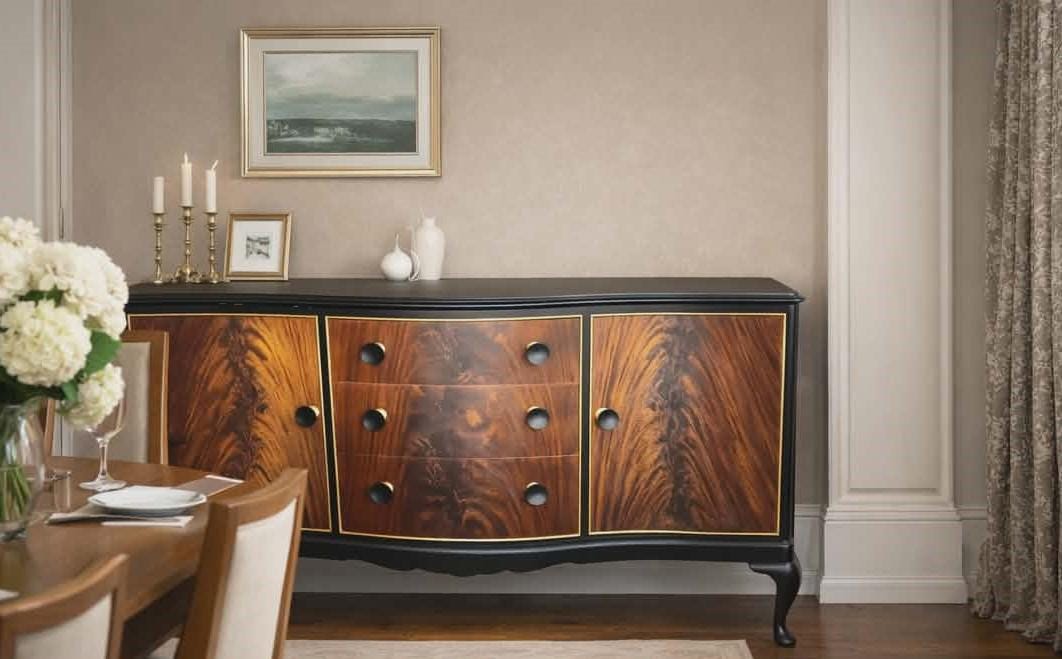 Refined Vintage Flame Mahogany Serpentine Sideboard in black with g...