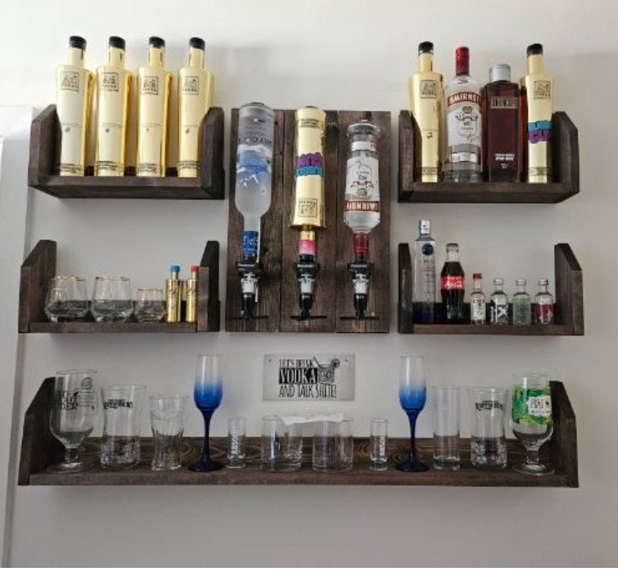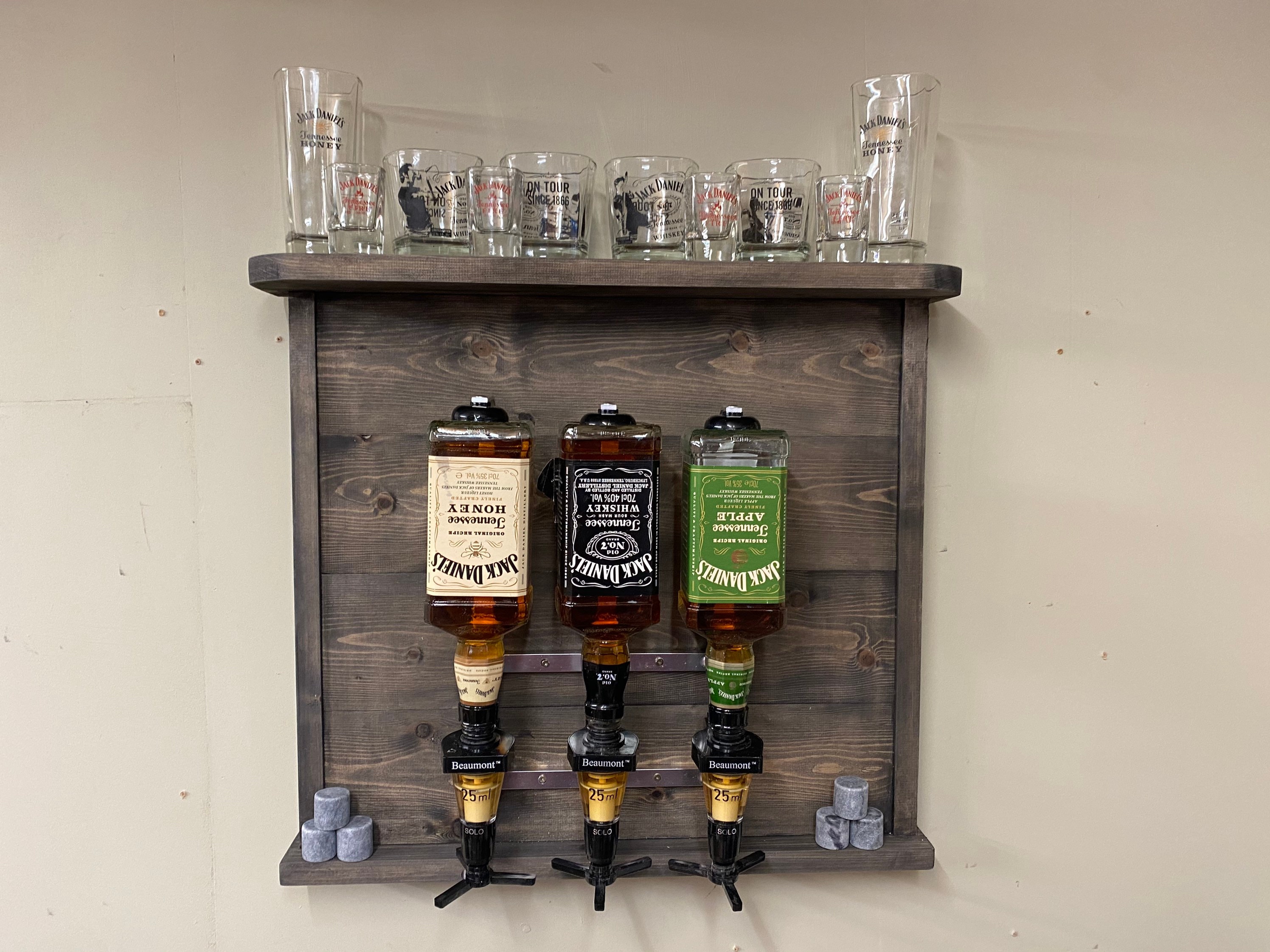 Handcrafted spirits optics plaque bar with shelves for glasses and additional bottle display Made fr...