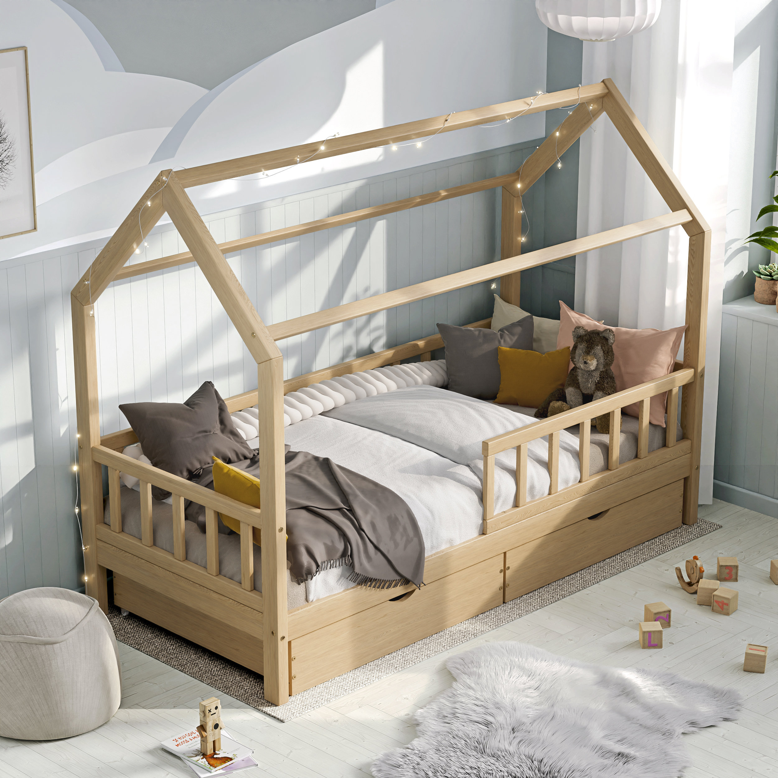 Montessori House Bed 90x200 with Pull Out Drawers, Solid Sood Bed F...