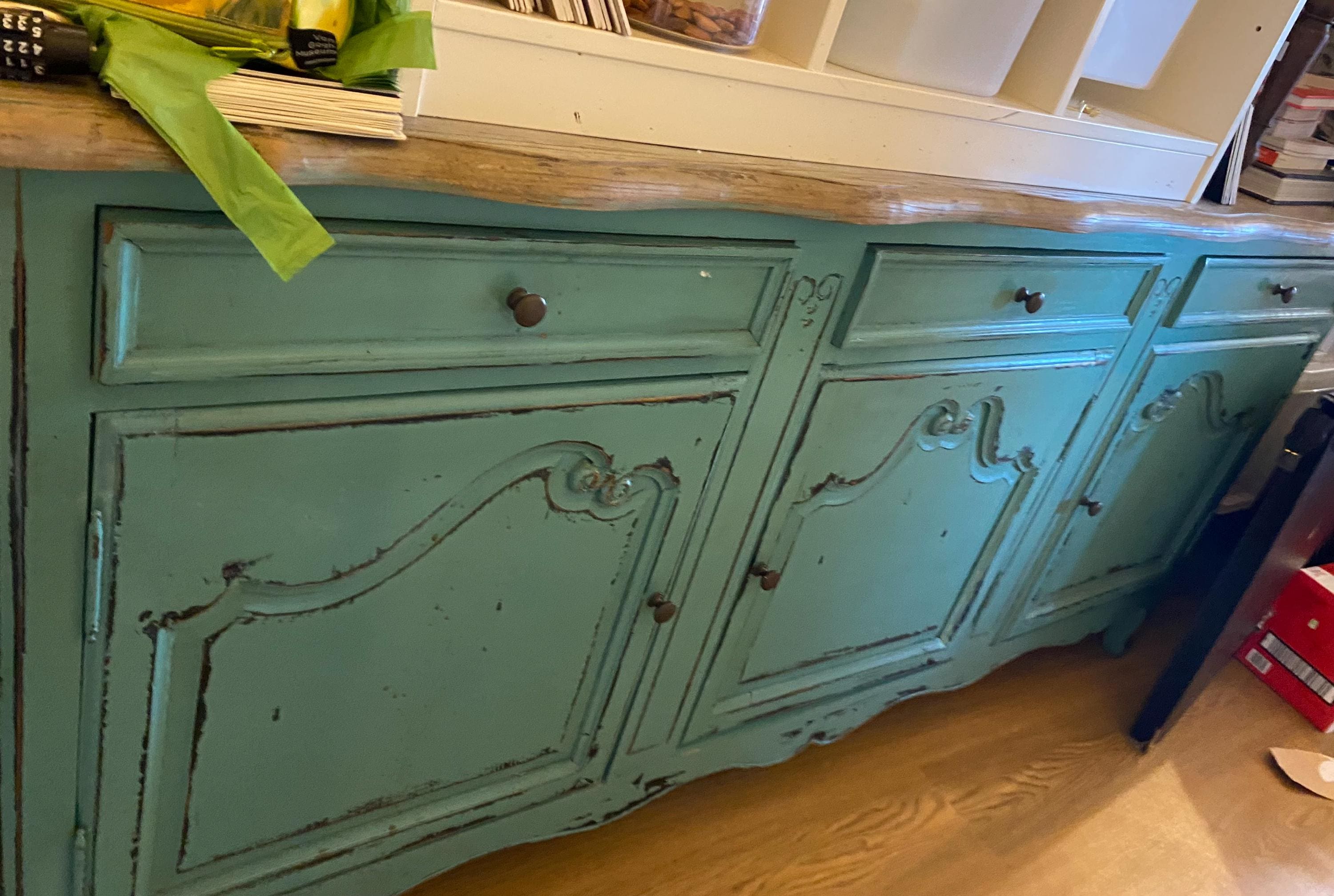 Large Vintage French Provincial Sideboard, Distressed Teal/Turquois...
