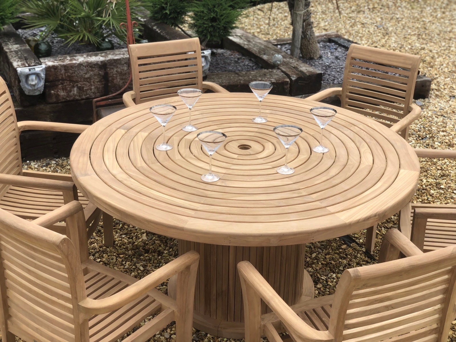 Teak Round table 150cm with 6 teak stacking chairs Built in 60cm lazy susan with parasol hole in cen...