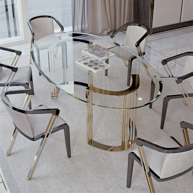 High Gloss Glass Wood Round Oval Luxury Dinning Table and Chairs Set of 6 Seater With Gold Leg for V...