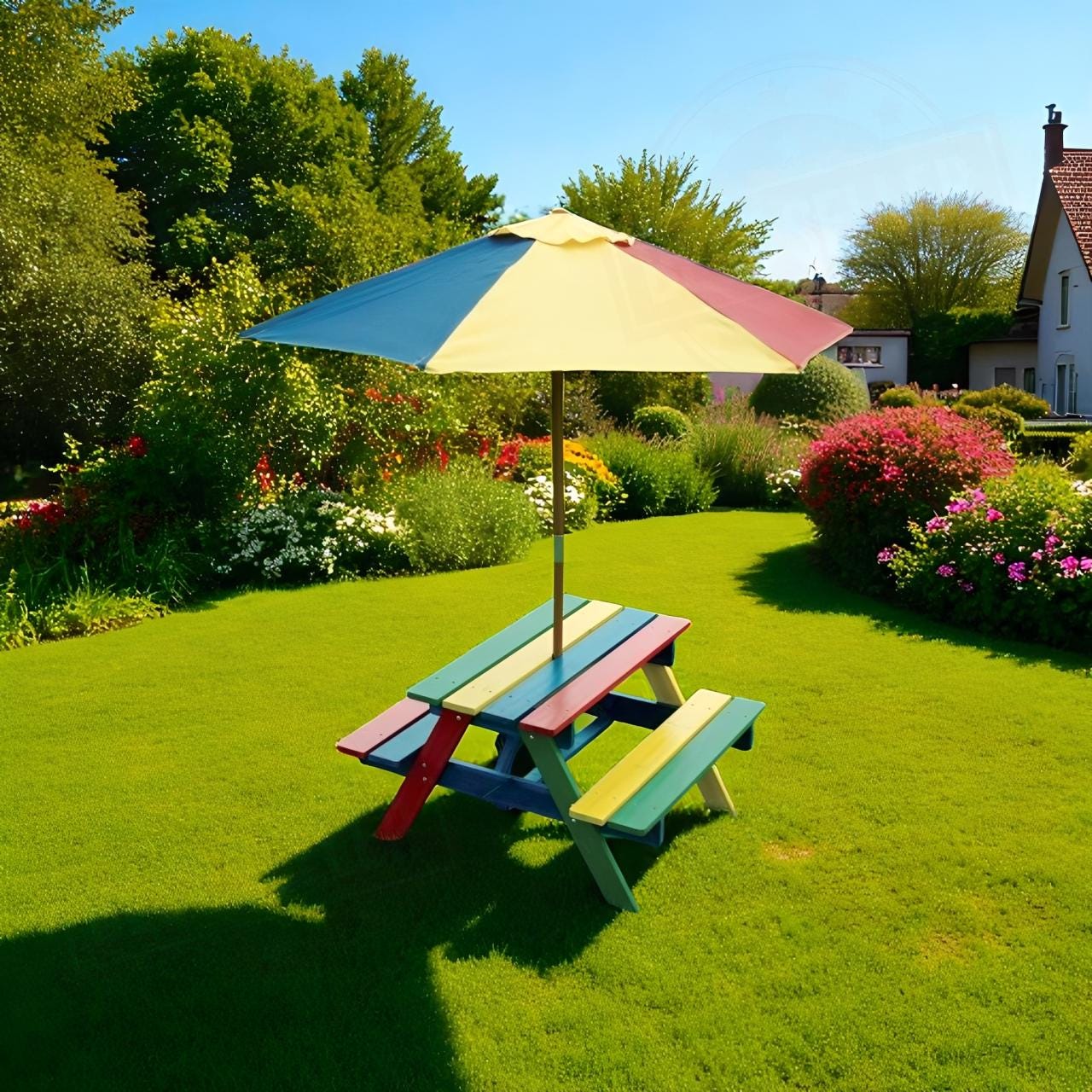 Bring fun, color, and comfort to your garden with this Kids Wooden Picnic Table and Rainbow Parasol ...