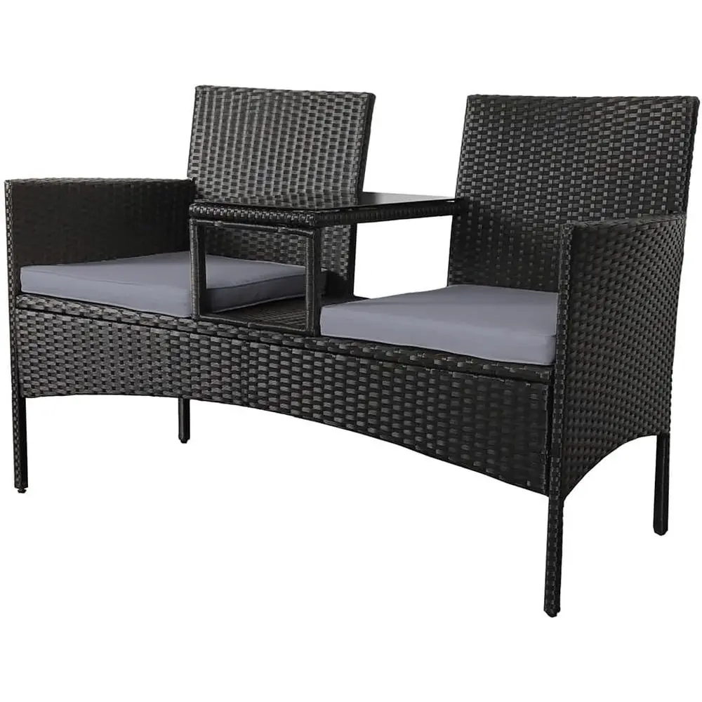 2 Seater Rattan Garden Bench with Cushions and Built-In Glass Table...