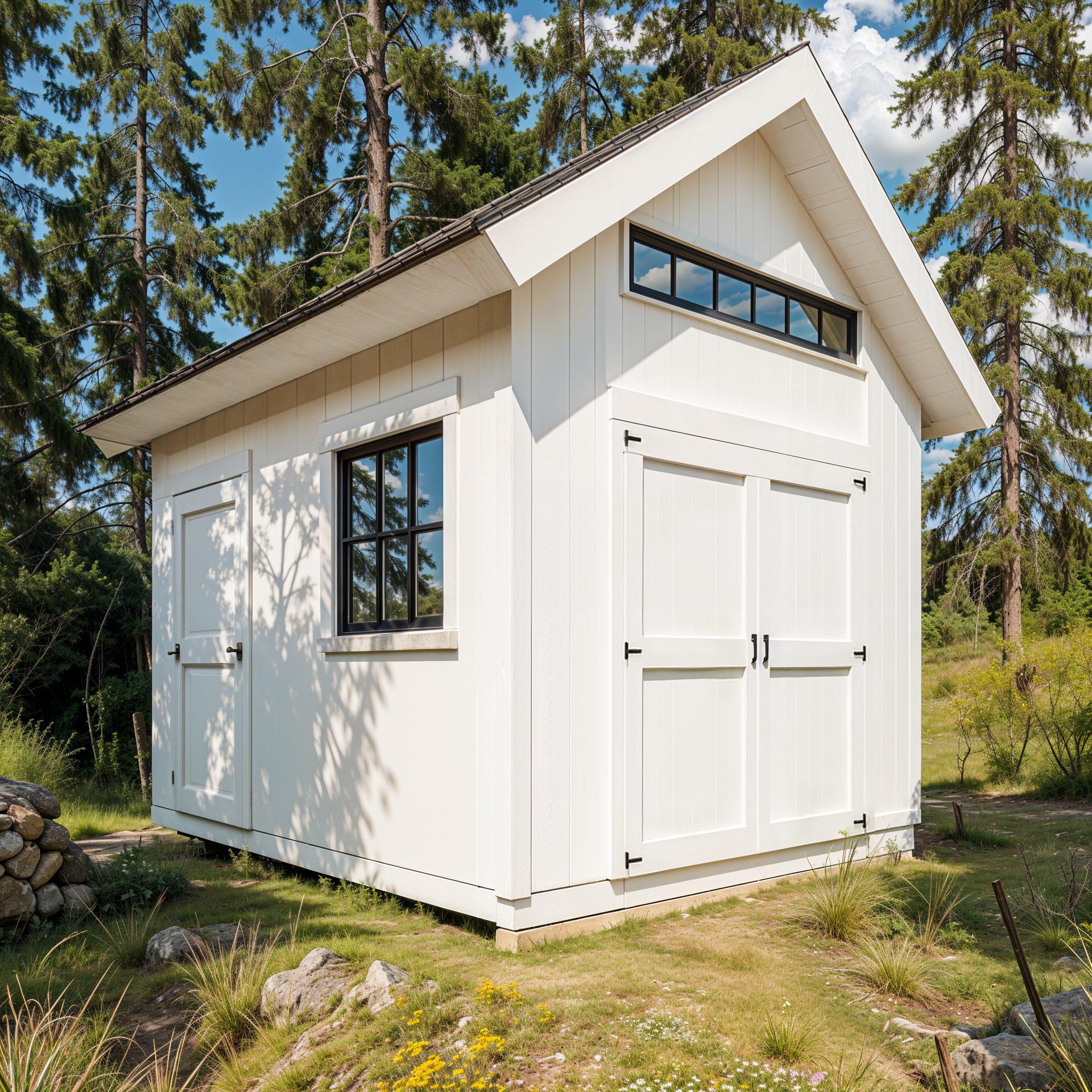 "A gabled shed, featuring a symmetrical double-sloped roof, stands independently and provides b...