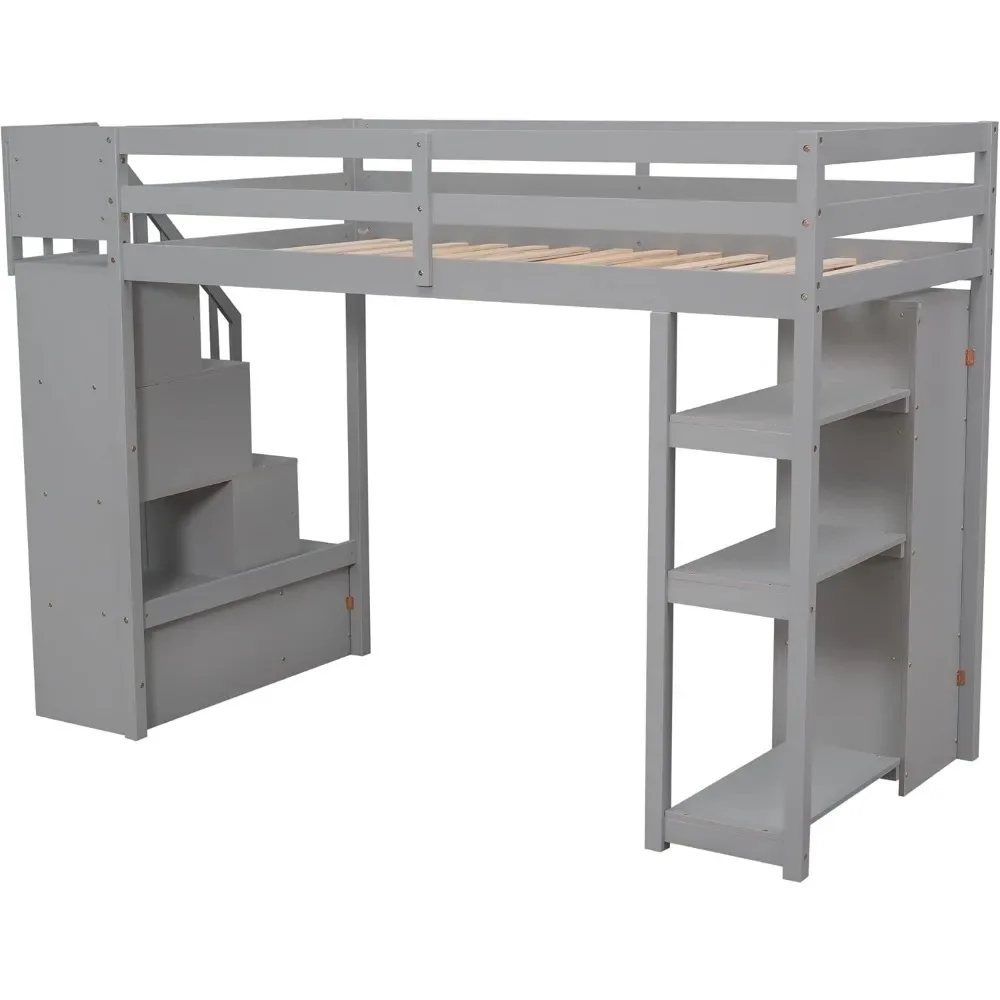 Twin Loft Bed with Stairs and Storage Drawers, Solid Wood Loft Bed Frame with Shelves for Kids Teens...