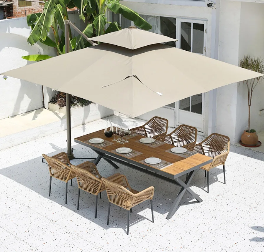 8PCS Outdoor Dining Set with Solar LED Cantilever Umbrella, 6 Woven...