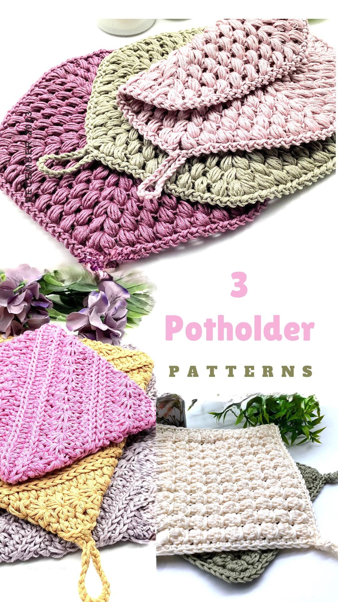 3 Potholders Pattern English Crochet Bundle 3 Hot Pads Potholders B...