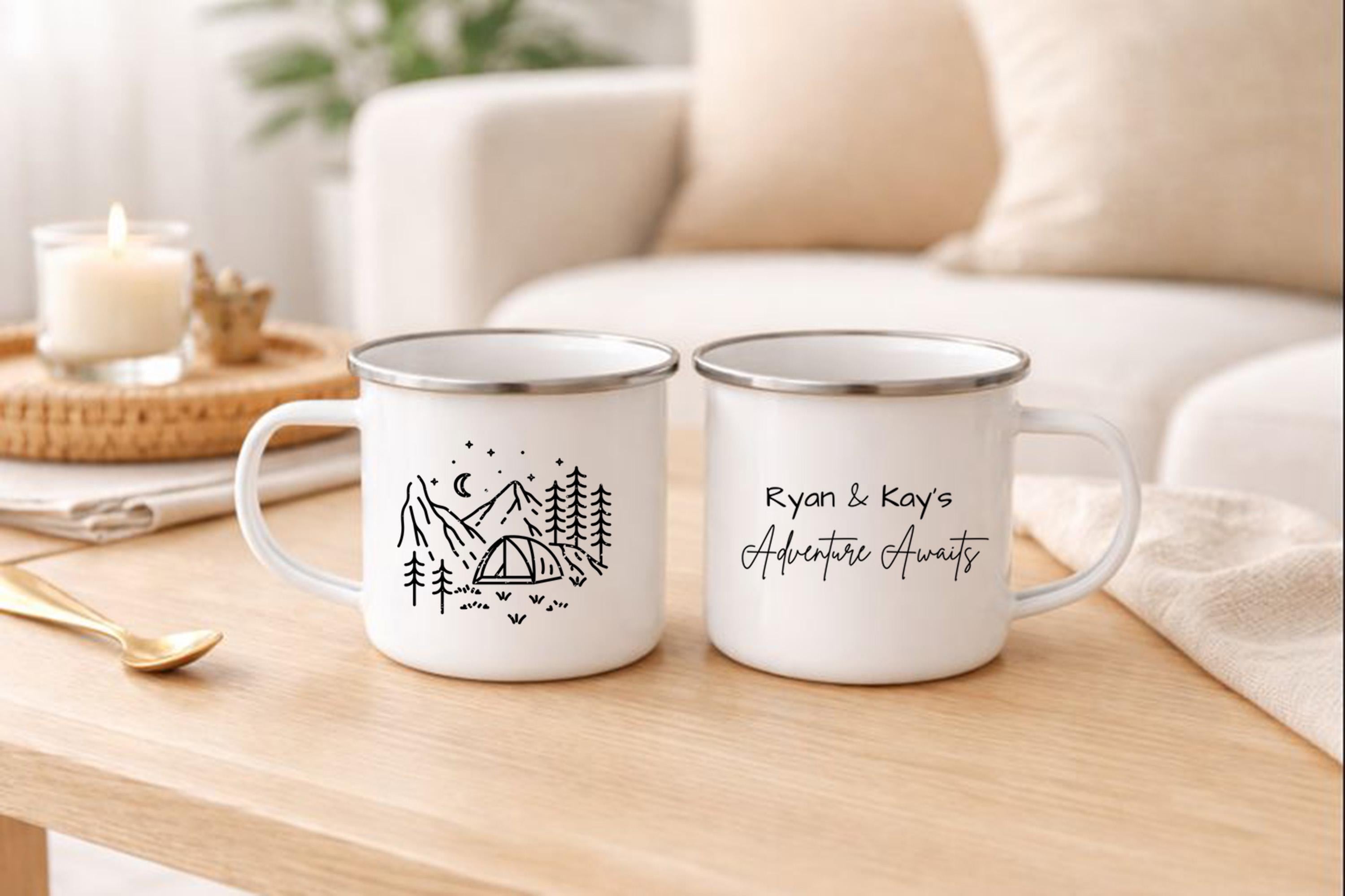 "Personalised Enamel Camping Mugs - Couple Mug Set | Adventure Awaits Gift These personalised e...