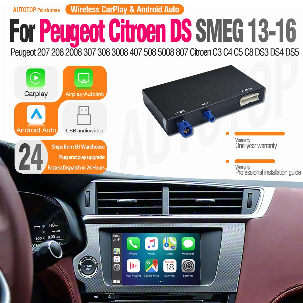 Wireless Carplay Android Auto Mirroring Airplay AutoLink GPS For Peugeot Citroen SMEG 208 308 508 30...