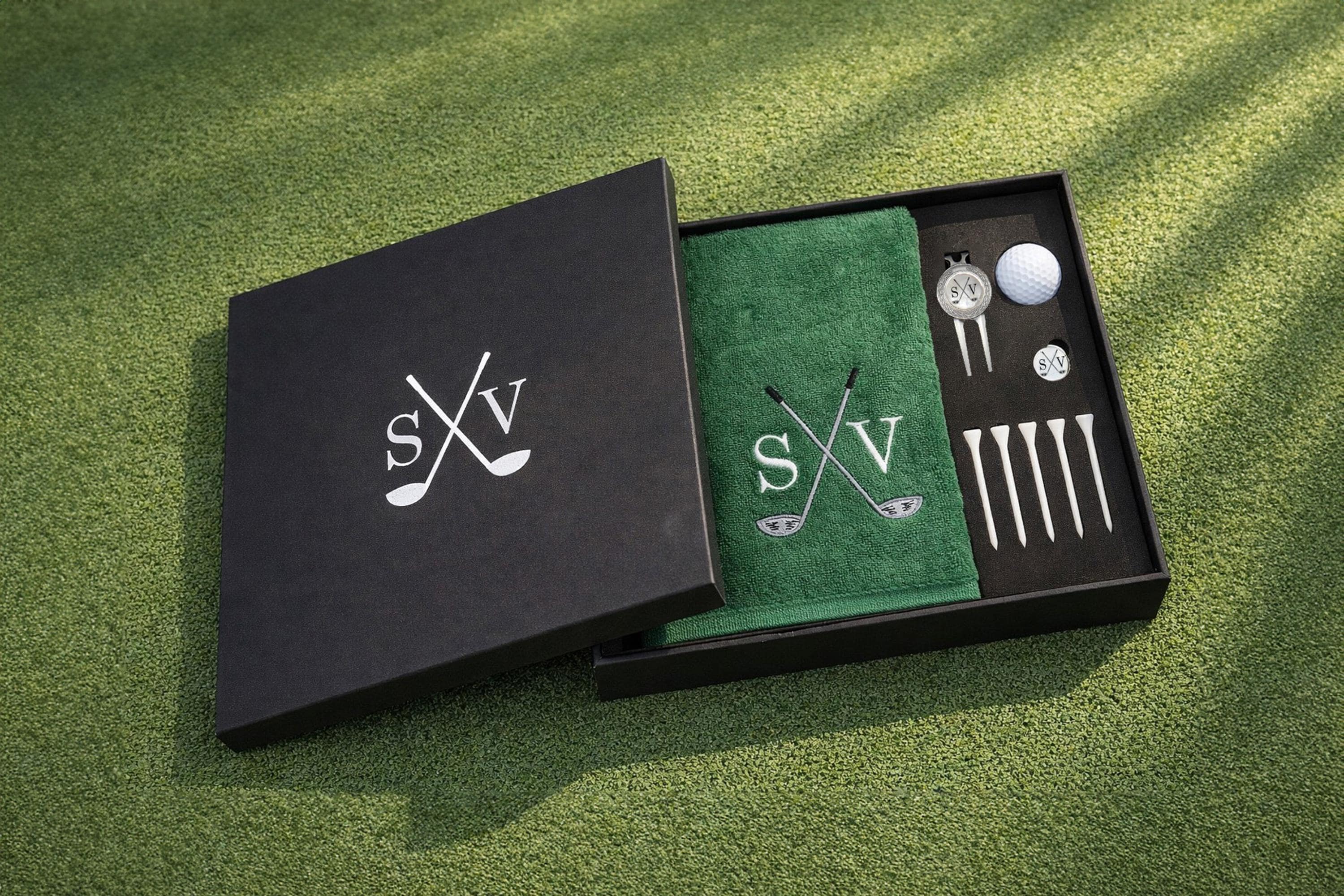 Personalised Golf Gift Box Set - Embroidered Golf Towel, Golf Repair Tool, Golf Ball Marker, Golf Te...