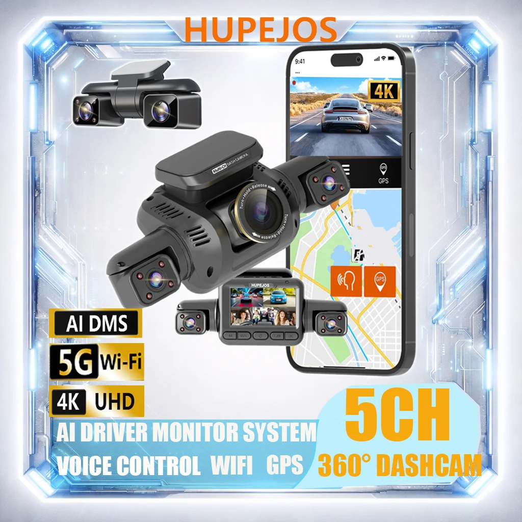 HUPEJOS 360° V8 Ultra-5CH 4K Dash Cam With AI Driver Monitor System DMS Built-in GPS WiFi Night ...