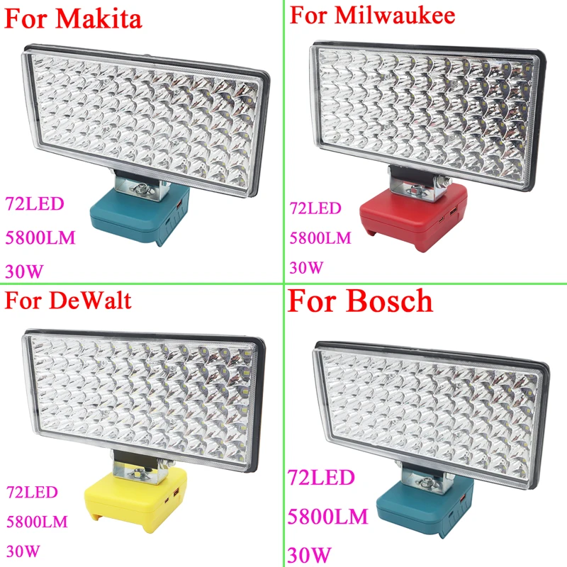 72 LEDs Work Light Flashlight Torch Type C USB Power Bank For Makita For DeWalt For Bosch For Milwau...