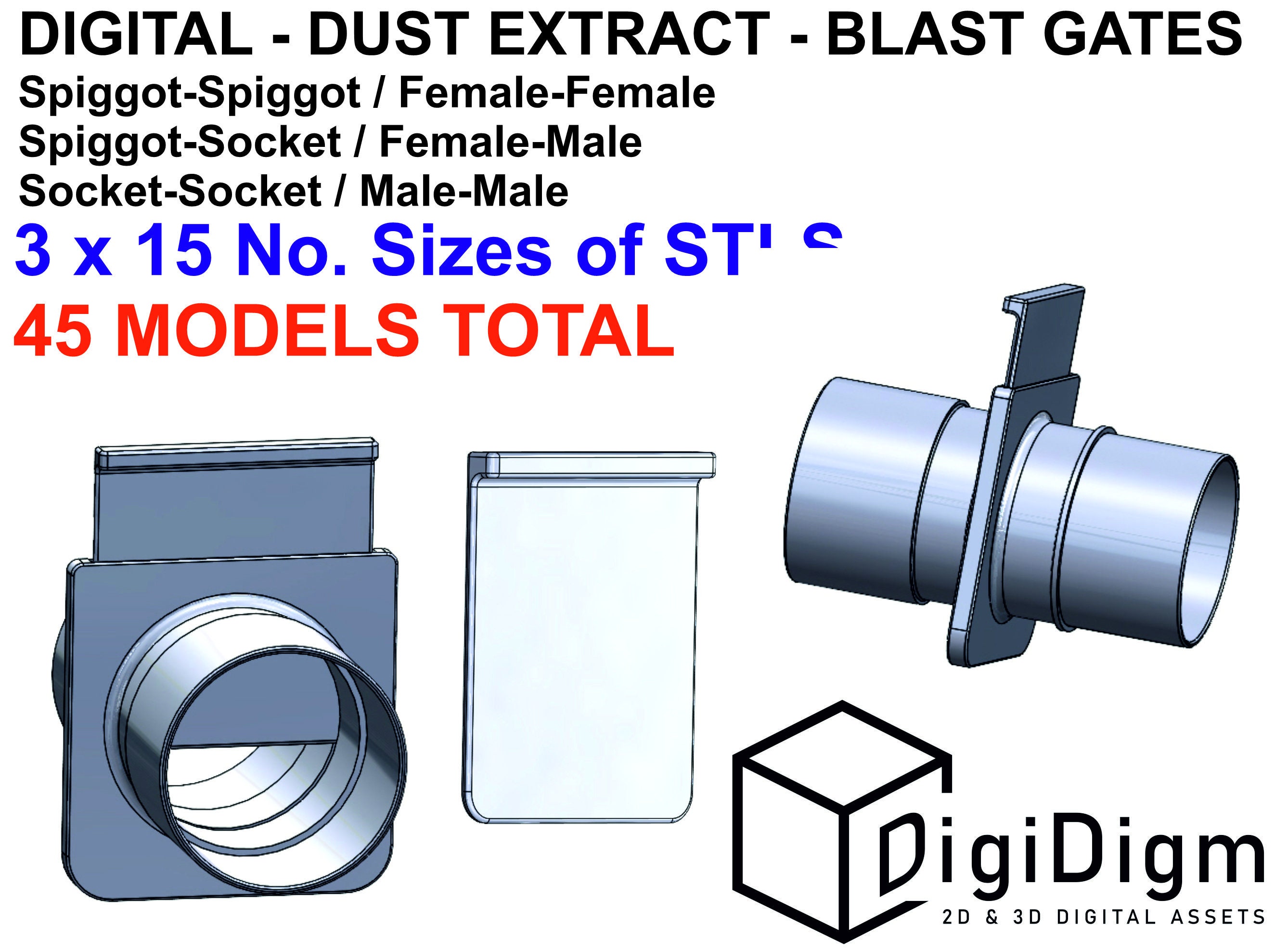 These are 45 No. STL Files of Extract Blast Gate / Air Valve Male to Male 15 no. Diameters, Male to ...